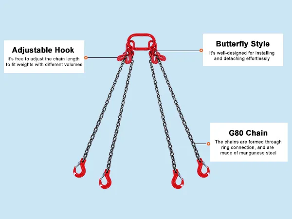 Met vier verstellers: Onze tilbanden zijn uitgerust met vier verstellers waarmee u de lengte van de ketting kunt aanpassen. Hierdoor is hij veiliger en stabieler bij het tillen van onregelmatige voorwerpen.