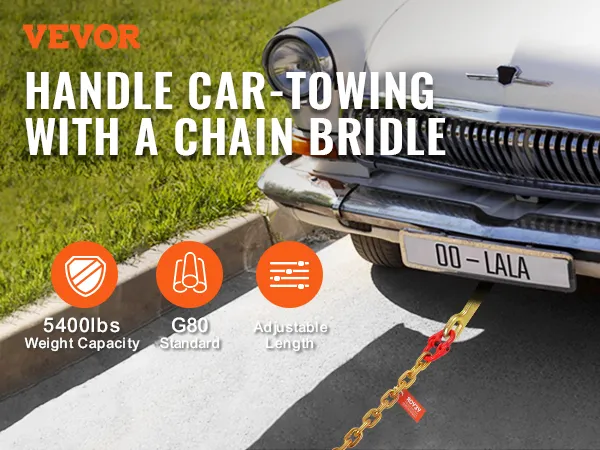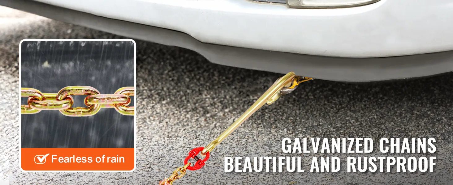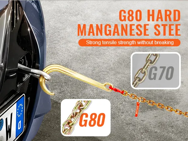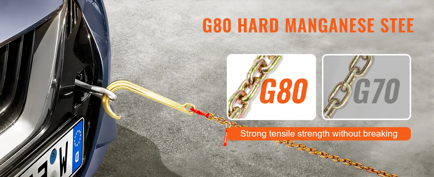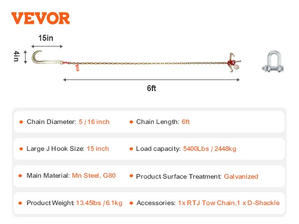 VEVOR, uw exclusieve gereedschapsexpert. Deze J-haakketting is gemaakt van hoogwaardig staal met een algehele sterkte van klasse 80. Ook is hij voorzien van haken die geschikt zijn voor verschillende soorten voertuigen.