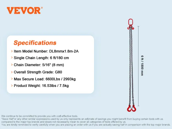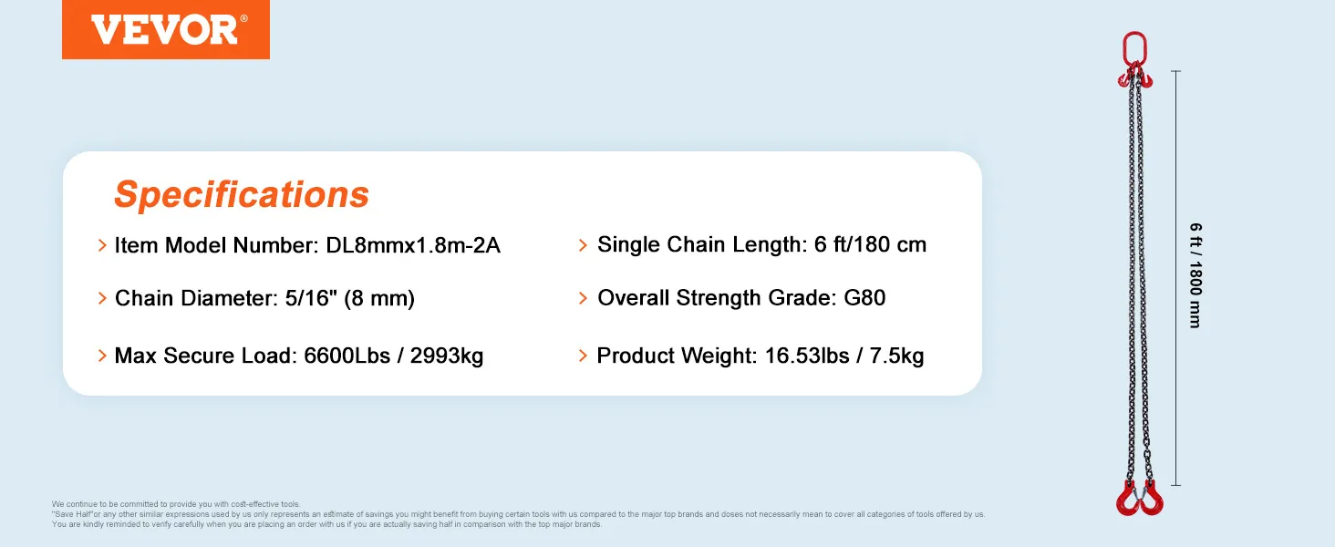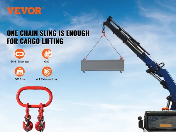 VEVOR, your exclusive tool expert. This chain sling is made of high-quality steel. It also has hooks with spring tongues to better grip and secure large cargo.