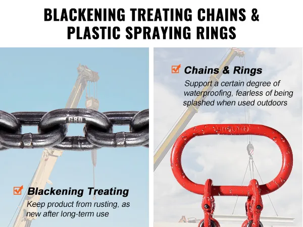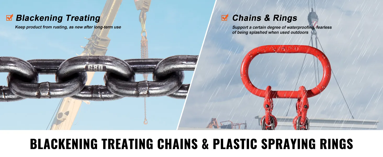 The lifting sling chains adopt a blackening treatment, and the rings/hooks adopt a plastic spraying treatment. They are beautiful and rustproof, as good as new after long-term use.