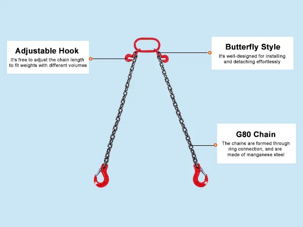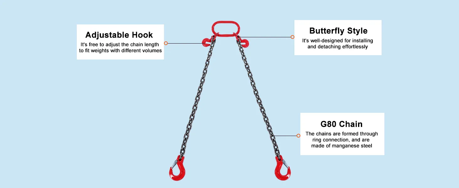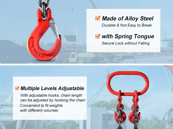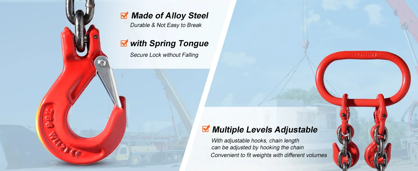 With Two Adjusters: Our sling chains are equipped with two adjusters, you can adjust the length of the chain through the adjusters. So that it will be safer and more stable when lifting irregular objects.