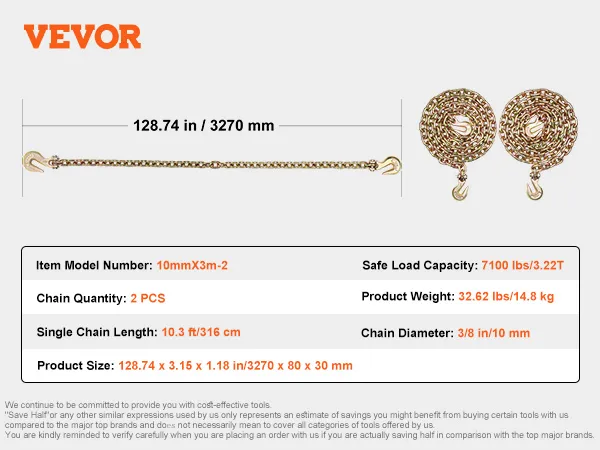VEVOR G80 transportketting, 3/8 inch x 10,3 voet, 2-pack sleepketting met gaffelhaak, veilige werklast van 7100 lbs, zware bosbouwketting voor het transport van sleepwagen-bindapparatuur