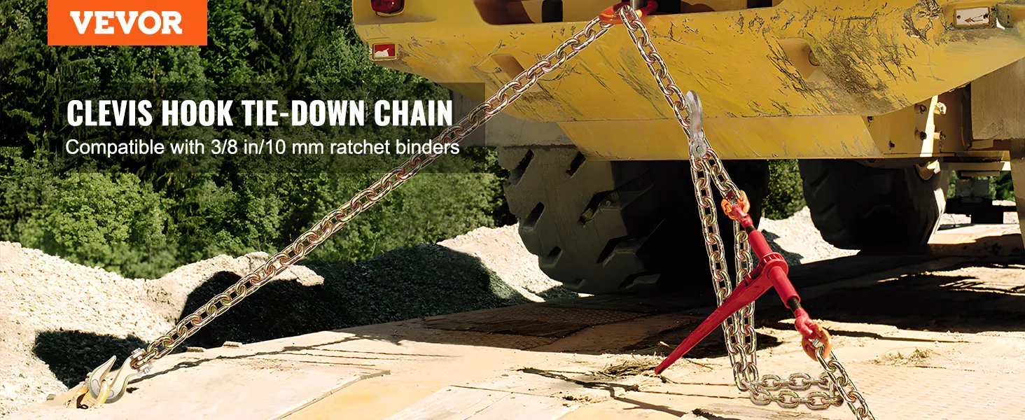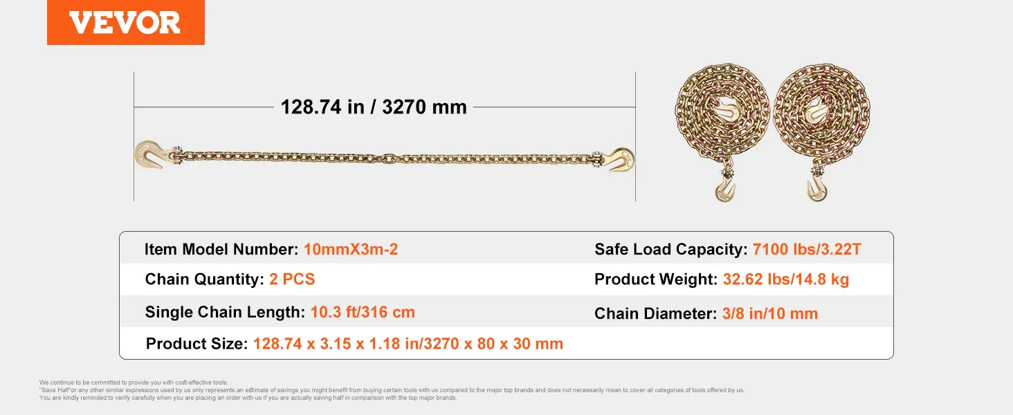3,22 ton (7100 lbs) sterk draagvermogen: Onze sleepketting kan een werklast van 3,22 ton (7100 lbs) aan. Met een veiligheidsfactor van 4:1 bent u verzekerd voor ladingen tot vier keer dit bedrag. Voel u veilig en zelfverzekerd elke keer dat u het gebruikt.