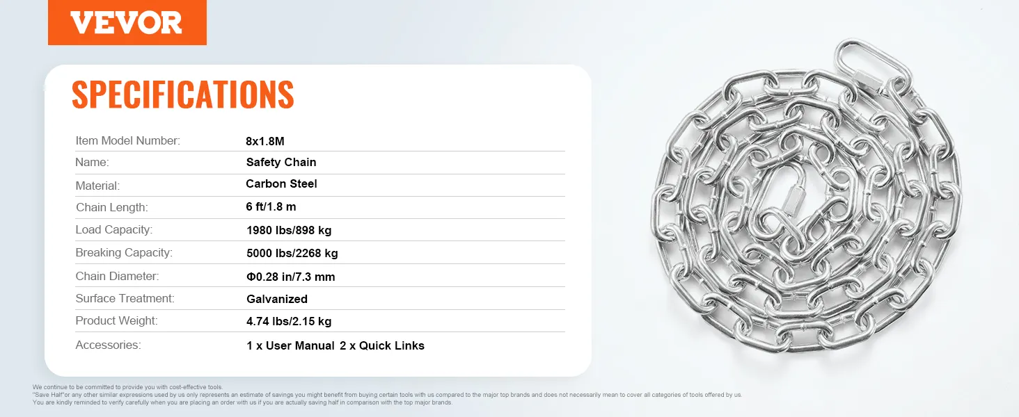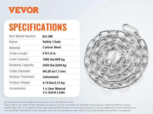 Hoog draagvermogen: onze robuuste stalen ketting is ontworpen voor diverse ophangtaken met een hoog draagvermogen en kan tot 898 kg dragen. Of het nu gaat om zwaar materieel, mechanische onderdelen, stalen materialen of zelfs uw auto, met deze ketting is alles gemakkelijk en veilig en kunt u met een gerust hart alle ophang- en ophangwerkzaamheden uitvoeren.
