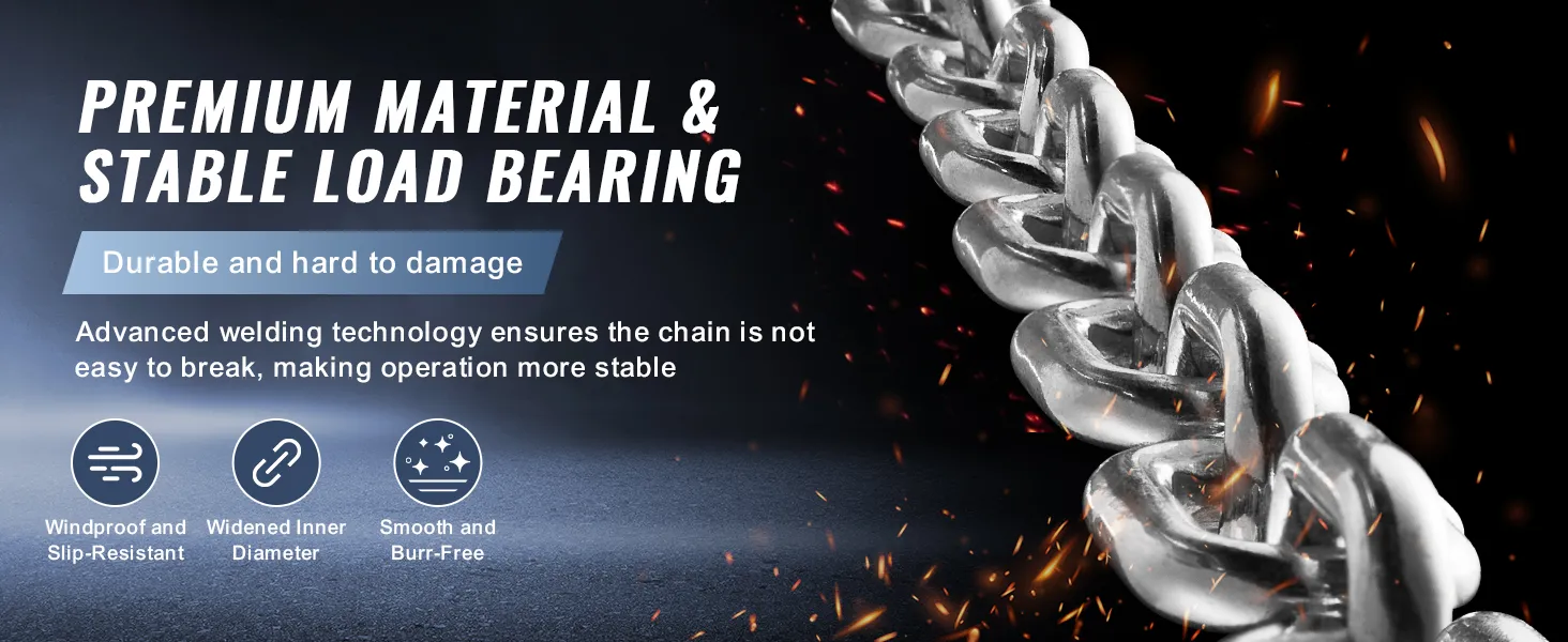 Robuust opgebouwd uit koolstofstaal: onze stalen ketting is gemaakt van massief koolstofstaal en met precisie gelast. Het is niet alleen sterk, maar ook betrouwbaar. De extra brede schakels en het winddichte en antislip-ontwerp houden alles stabiel, wat je ook ophangt.