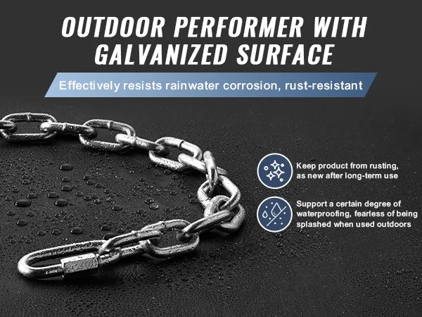 Perfect voor buitenavonturen: deze gegalvaniseerde stalen ketting is niet alleen voor gebruik binnenshuis, hij is spatwaterdicht en geschikt voor gebruik buitenshuis. Van het trekken van boomstammen tot het ophangen van lampen, het vastzetten van kleding en het veilig houden van uw hond: hij is veelzijdig genoeg voor alles wat het leven u te bieden heeft.