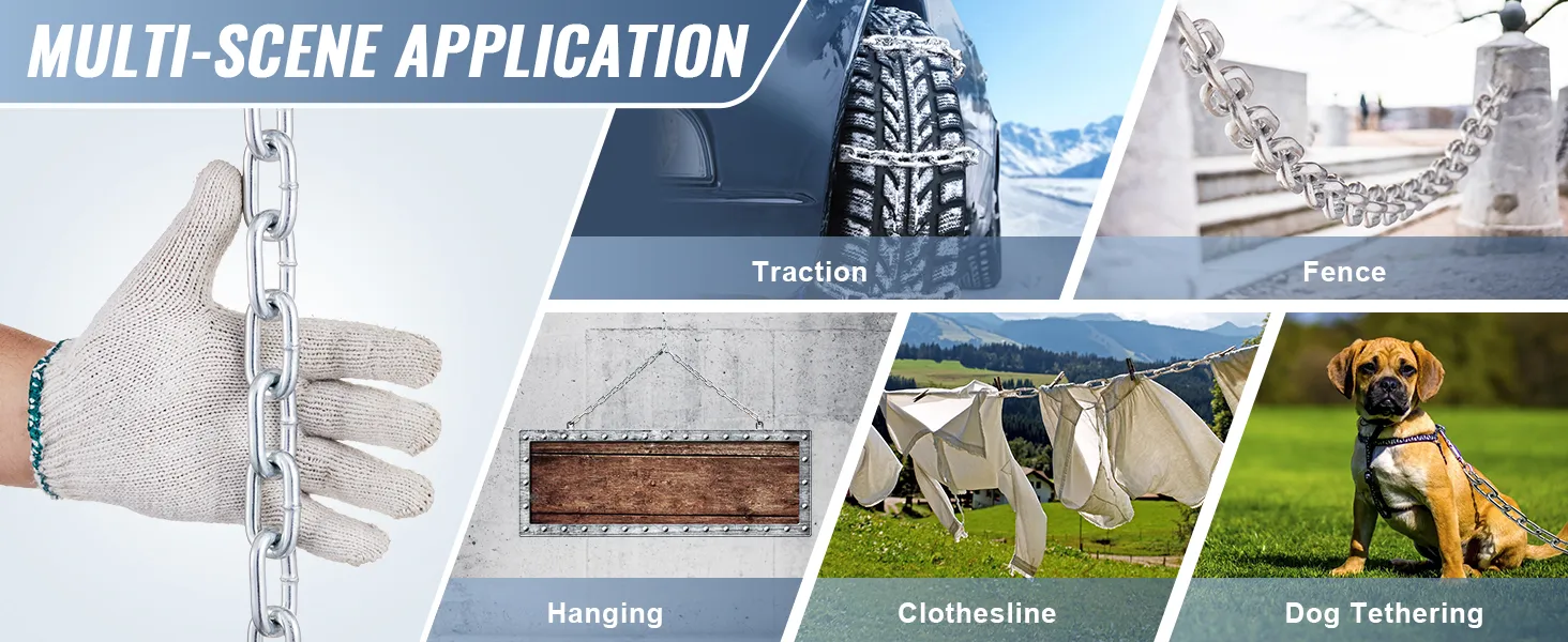 Deze stalen ketting van hoogwaardige materialen wordt versterkt met behulp van moderne lasprocessen. De antislip- en winddichte eigenschappen en een grotere binnendiameter zorgen ervoor dat hij stabiel blijft tijdens gebruik. Het gladde, braamvrije oppervlak maakt het gebruik comfortabel.