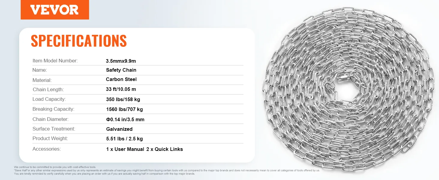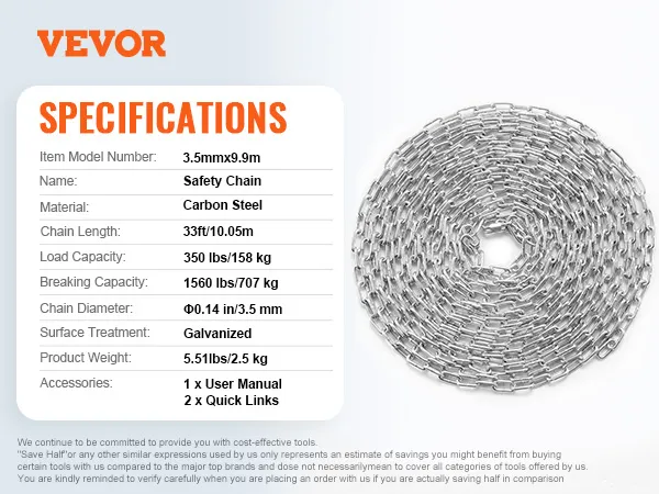 Deze gegalvaniseerde spiraalketting is ideaal voor allerlei taken: of het nu gaat om het slepen, ophangen, drogen van kleding of het vastzetten van huisdieren, hij klaart de klus. Het is een geweldige keuze voor buitenavonturen, thuisprojecten en meer.