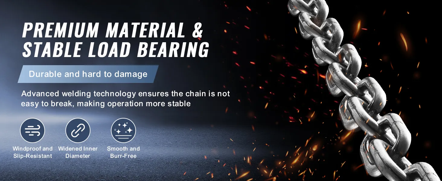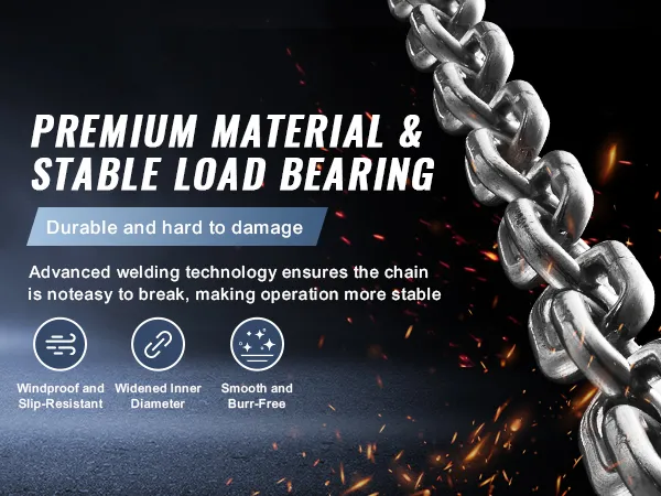 Deze ketting van hoogwaardige materialen wordt versterkt met behulp van moderne lasprocessen. De antislip- en winddichte eigenschappen en de grotere binnendiameter zorgen ervoor dat hij stabiel blijft tijdens gebruik. Het gladde, braamvrije oppervlak maakt het gebruik comfortabel.