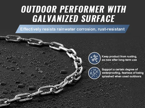 Perfect voor buitenavonturen: deze gegalvaniseerde stalen ketting is niet alleen voor gebruik binnenshuis, hij is spatwaterdicht en geschikt voor gebruik buitenshuis. Van het trekken van boomstammen tot het ophangen van lampen, het vastzetten van kleding en het veilig houden van uw hond: hij is veelzijdig genoeg voor alles wat het leven u te bieden heeft.
