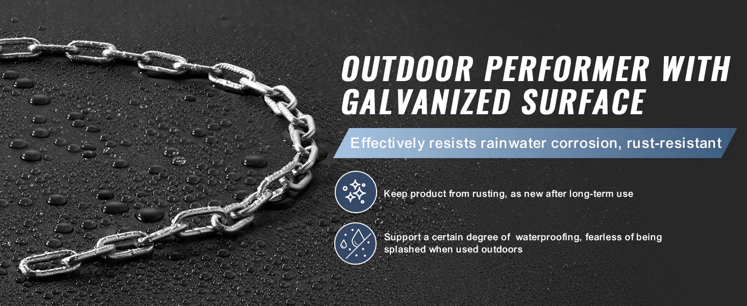 Langdurige oppervlaktebehandeling: Dankzij het gegalvaniseerde oppervlak is deze geteste stalen ketting bestand tegen corrosie door regenwater, roest niet en ziet er ook na buitengebruik nog steeds als nieuw uit. U hoeft zich geen zorgen te maken dat regen of vocht er invloed op heeft.
