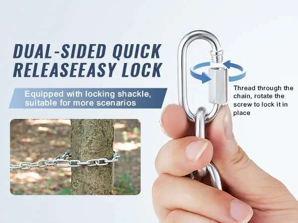 De koolstofstalen ketting is voorzien van twee snelschakels die met een simpele druk op hun plaats worden vergrendeld, waardoor de installatie snel en probleemloos verloopt. Deze schakels zijn veelzijdig en verhogen de veiligheid, waar en hoe u de ketting ook gebruikt.