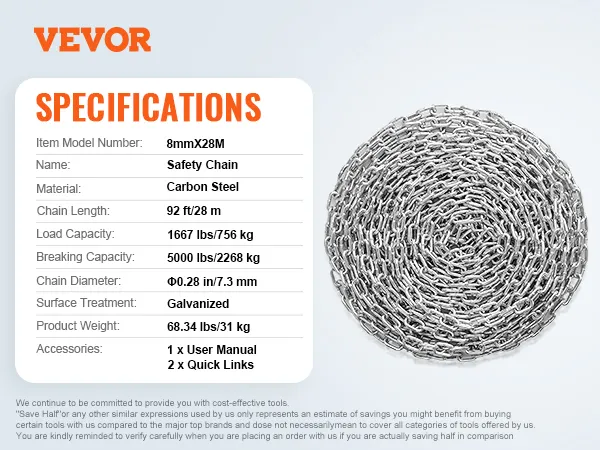 VEVOR Proof Coil Chain, 5/16" x 92', 1667 lbs veilige werklast, gegalvaniseerde Proof Coil Chain met twee snelkoppelingen, verzinkte koolstofstalen schakelketting voor slepen, ophangen, kamperen en het slepen van huisdieren