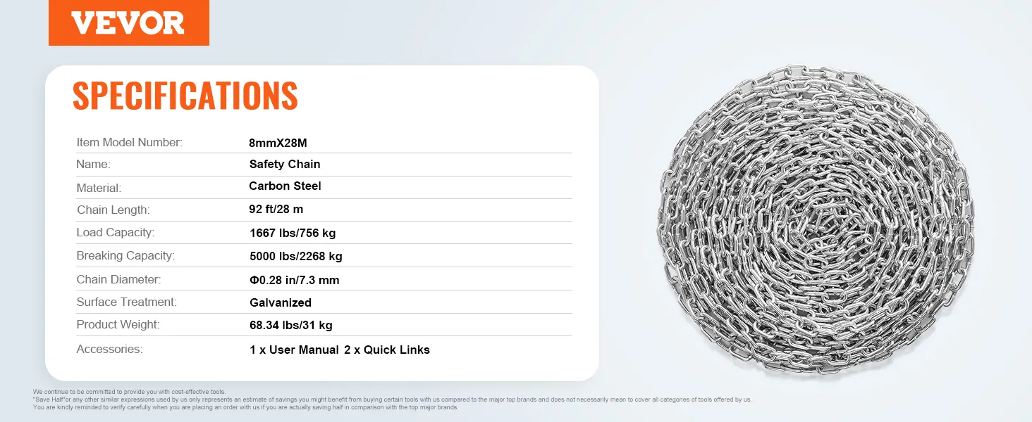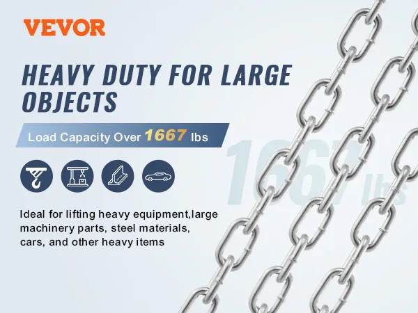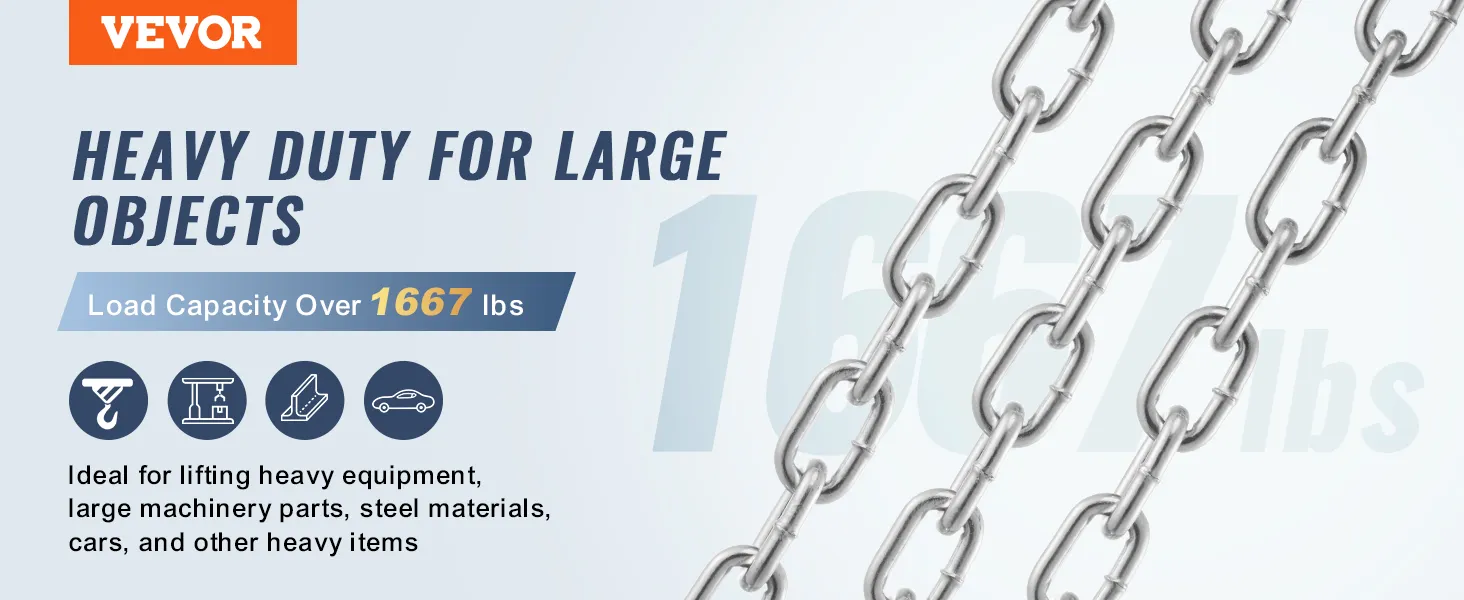 Hoog draagvermogen: onze robuuste stalen ketting is ontworpen voor verschillende ophangtaken met een hoog draagvermogen en kan tot 756 kg dragen. Of het nu gaat om zwaar materieel, mechanische onderdelen, stalen materialen of zelfs uw auto, met deze ketting is alles gemakkelijk en veilig en kunt u met een gerust hart alle ophang- en ophangwerkzaamheden uitvoeren.