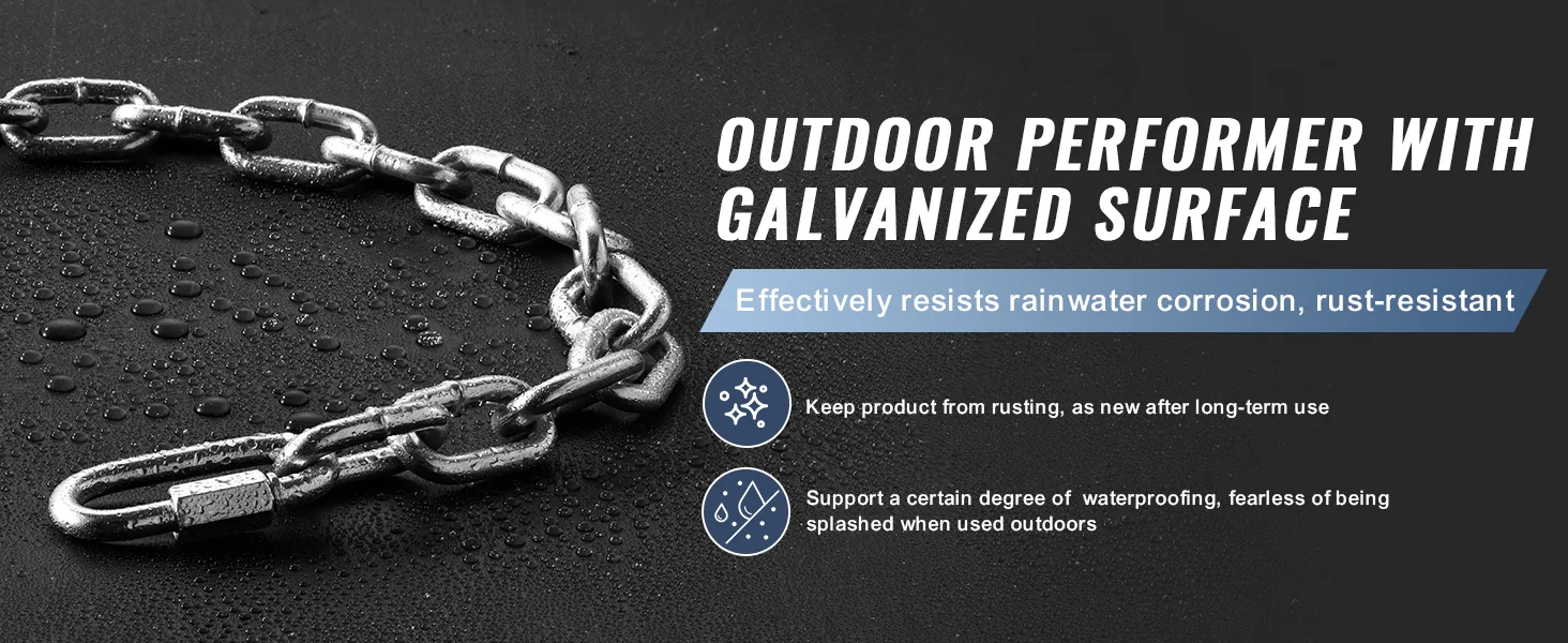 Duurzame oppervlaktebehandeling: Dankzij het gegalvaniseerde oppervlak is deze geteste stalen ketting bestand tegen corrosie door regenwater, roest niet en ziet er ook na buitengebruik nog steeds als nieuw uit. U hoeft zich geen zorgen te maken dat regen of vocht er invloed op heeft.