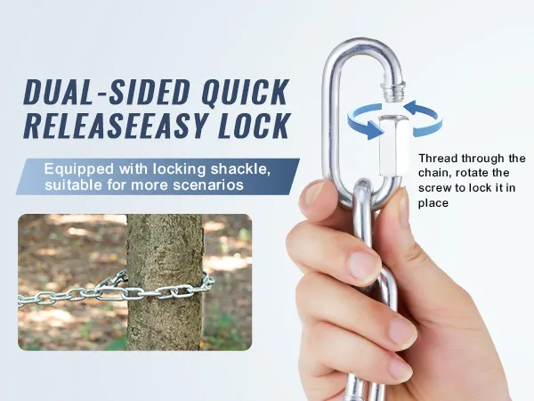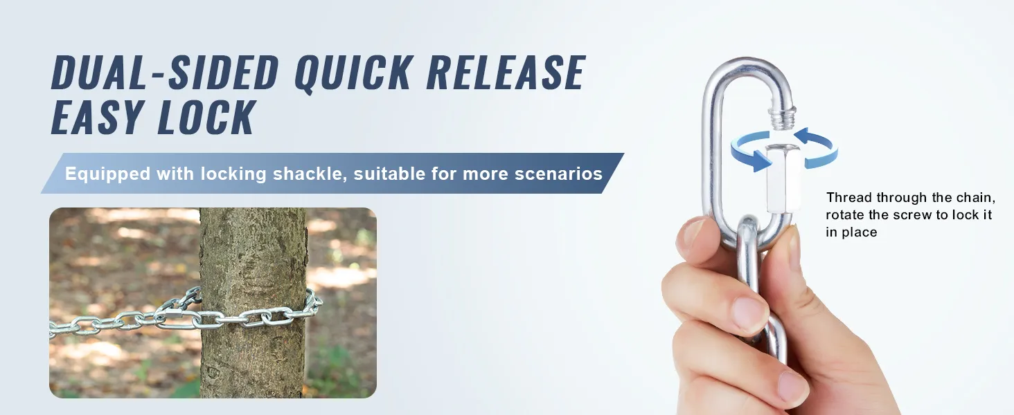 De koolstofstalen ketting is voorzien van twee snelschakels die met een simpele druk op hun plaats worden vergrendeld, waardoor de installatie snel en probleemloos verloopt. Deze schakels zijn veelzijdig en verhogen de veiligheid, waar en hoe u de ketting ook gebruikt.