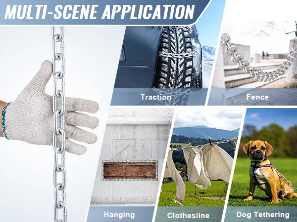 Deze gegalvaniseerde stalen ketting is ideaal voor allerlei taken: of het nu gaat om het slepen, ophangen, drogen van kleding of het vastzetten van huisdieren, hij klaart de klus. Het is een geweldige keuze voor buitenavonturen, thuisprojecten en meer.
