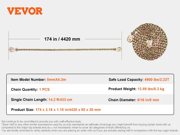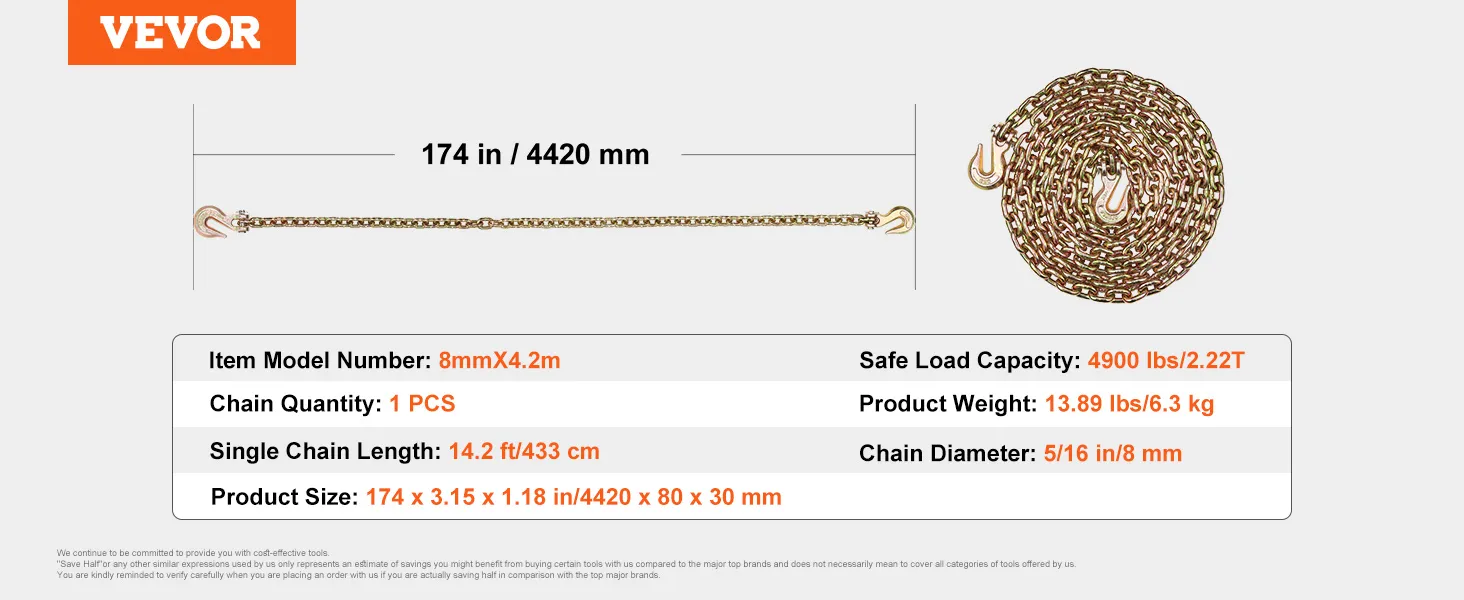2,22 ton (4900 lbs) sterk draagvermogen: onze sleepketting kan een werklast van 2,22 ton (4900 lbs) aan. Met een veiligheidsfactor van 4:1 bent u verzekerd voor ladingen tot vier keer dit bedrag. Voel u veilig en zelfverzekerd elke keer dat u het gebruikt.