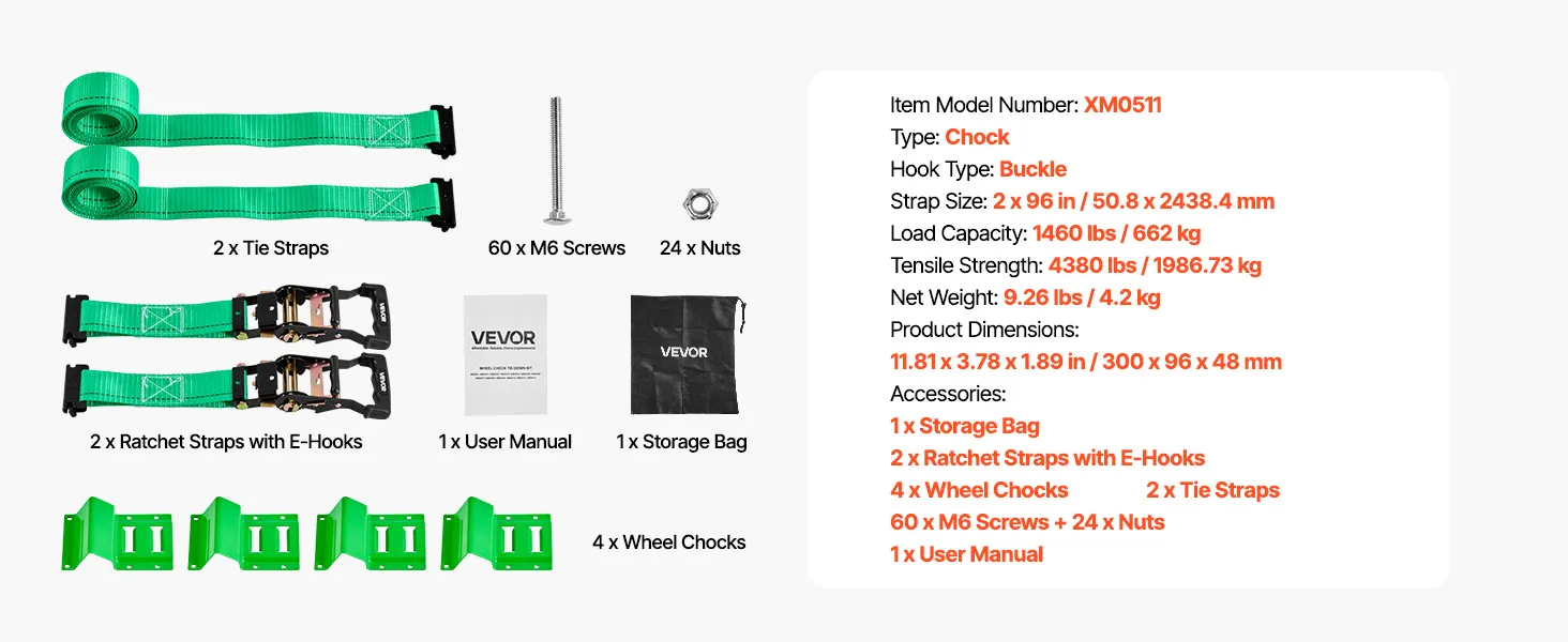 Bandvriendelijk ontwerp: dankzij zachte materialen en rubberen blokken die direct tegen de band aanliggen, minimaliseert onze spanband wrijving en druk, waardoor uw banden en velgen onbeschadigd blijven tijdens transport. De set bestaat uit twee sets robuuste ratels, twee sets spanbanden van 96 inch (2438,4 mm) lang en vier sets wielblokken.