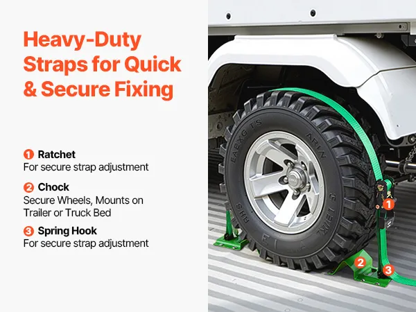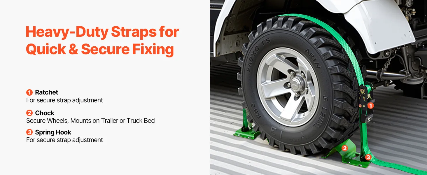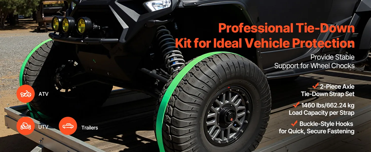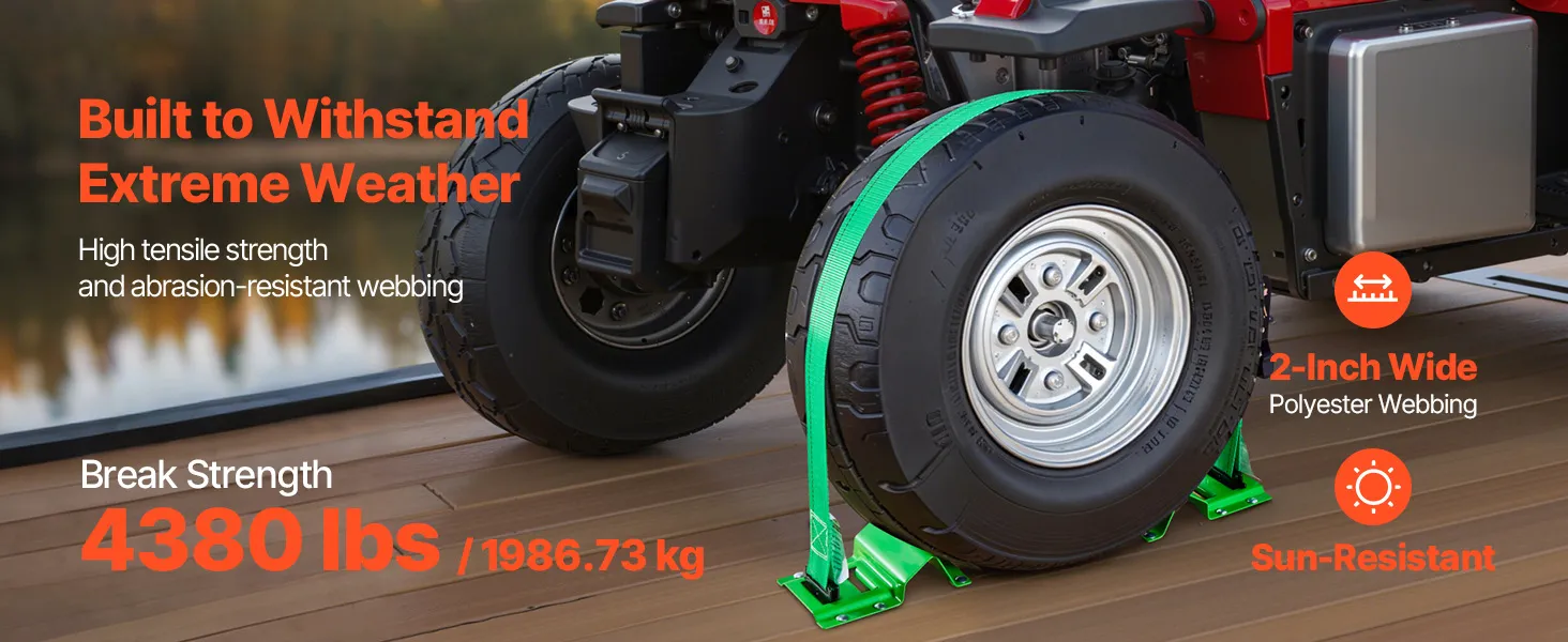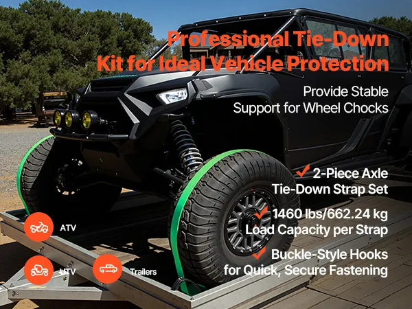 Meer dan alleen een wielbevestigingsband. De asriemen in onze wielbevestigingsset minimaliseren schade aan banden en ophanging tijdens transport en zijn ideaal voor voertuigen zonder handremmen of op hellingen. Elke riem kan tot 662 kg dragen en zorgt ervoor dat uw voertuig stabiel blijft tijdens transport of parkeren.