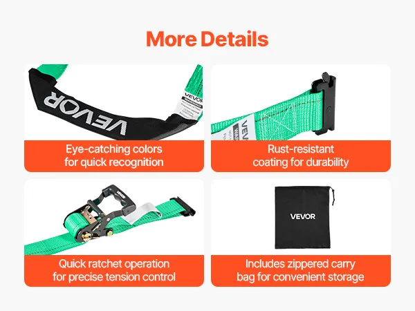 Dankzij het opvallende, heldere kleurenontwerp is deze bandenriem gemakkelijk te herkennen en te gebruiken. De roestbestendige afwerking garandeert duurzaamheid, terwijl de opbergtas met ritssluiting hem draagbaar en gemakkelijk op te bergen maakt voor betrouwbaar gebruik.