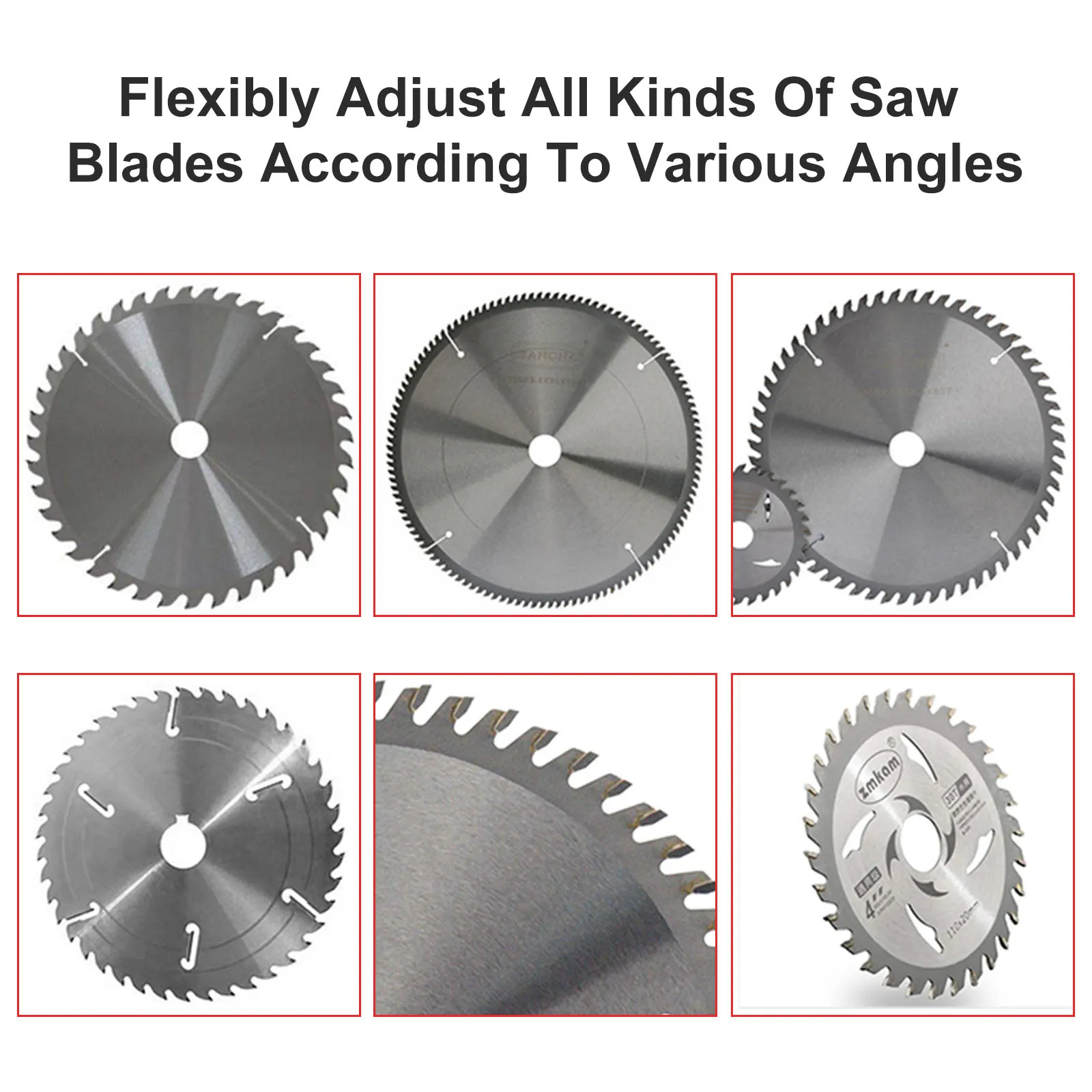 Draaihoek van het handvat: 30° van links en 45° van rechts. De tafelzaagslijper is ontworpen met een draaitafel, waarmee u eenvoudig de snijrand van de invoerhoek kunt aanpassen.