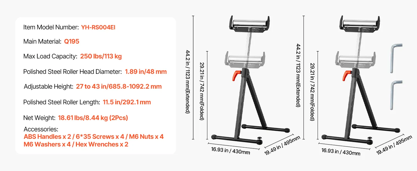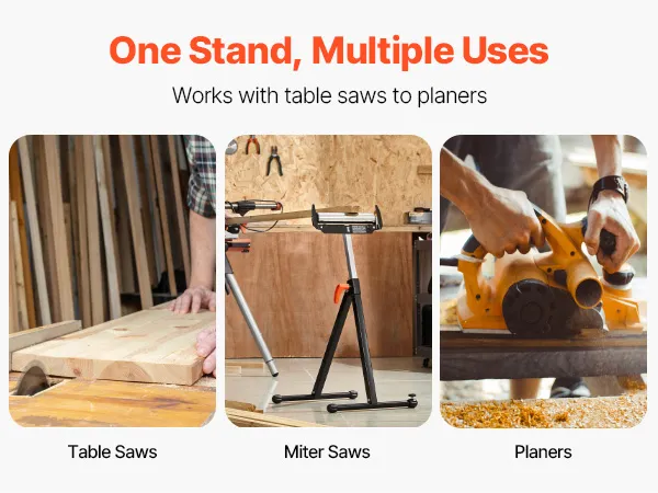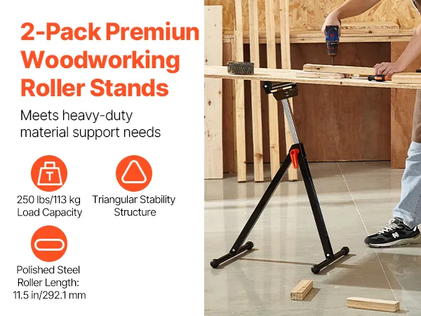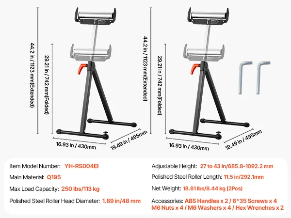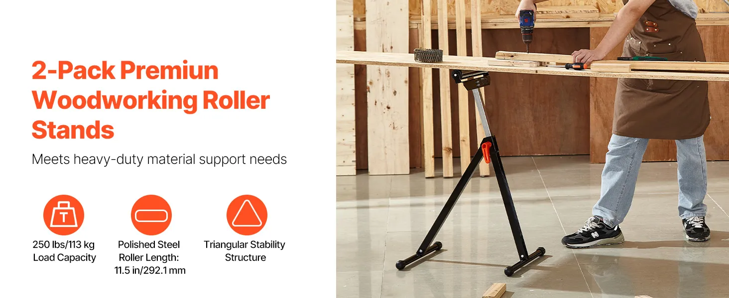 The folding roller stand features easy storage, max load capacity of 250 lbs, and adjustable height from 27 to 43 in. The smooth 11.5-inch roller head allows for effortless movement of large panels as table saw extension, making your woodworking tasks a breeze.