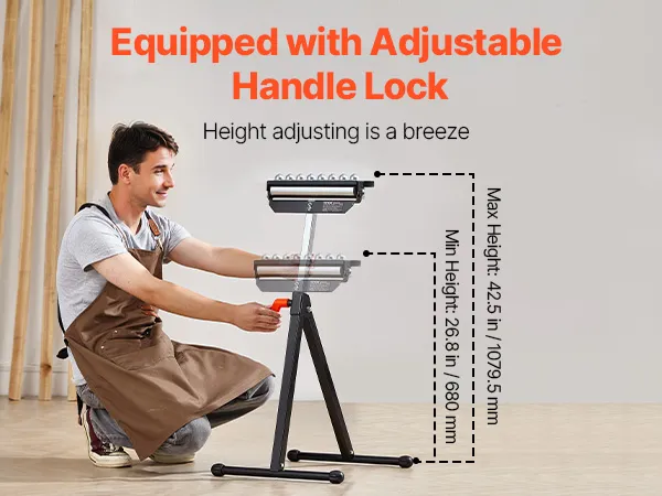 Het roltafelzaagonderstel is voorzien van een ABS-verstelhendelvergrendeling, waarmee u de hoogte van het onderstel eenvoudig kunt aanpassen van 68 tot 108 cm, afhankelijk van uw behoeften. Dit zorgt voor flexibiliteit tijdens het gebruik.