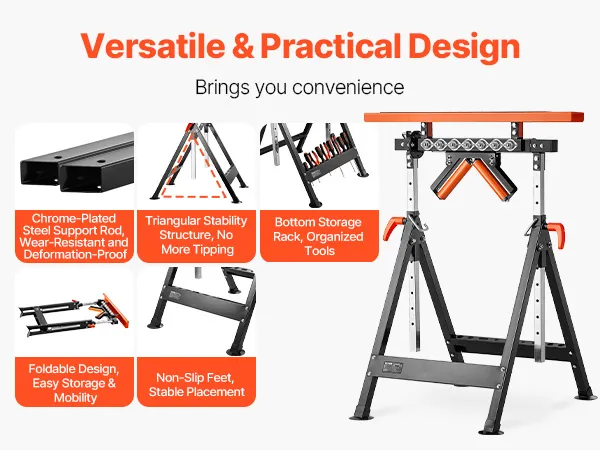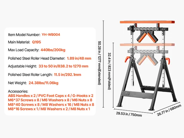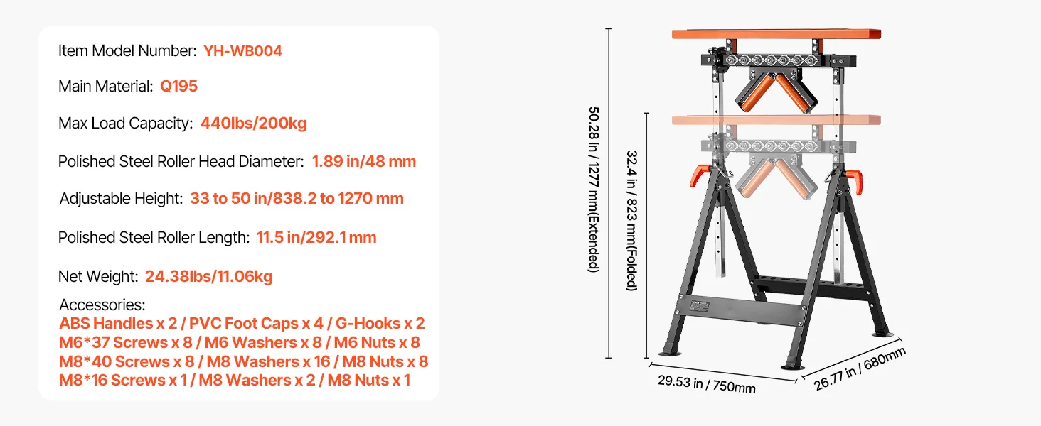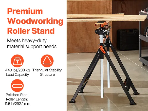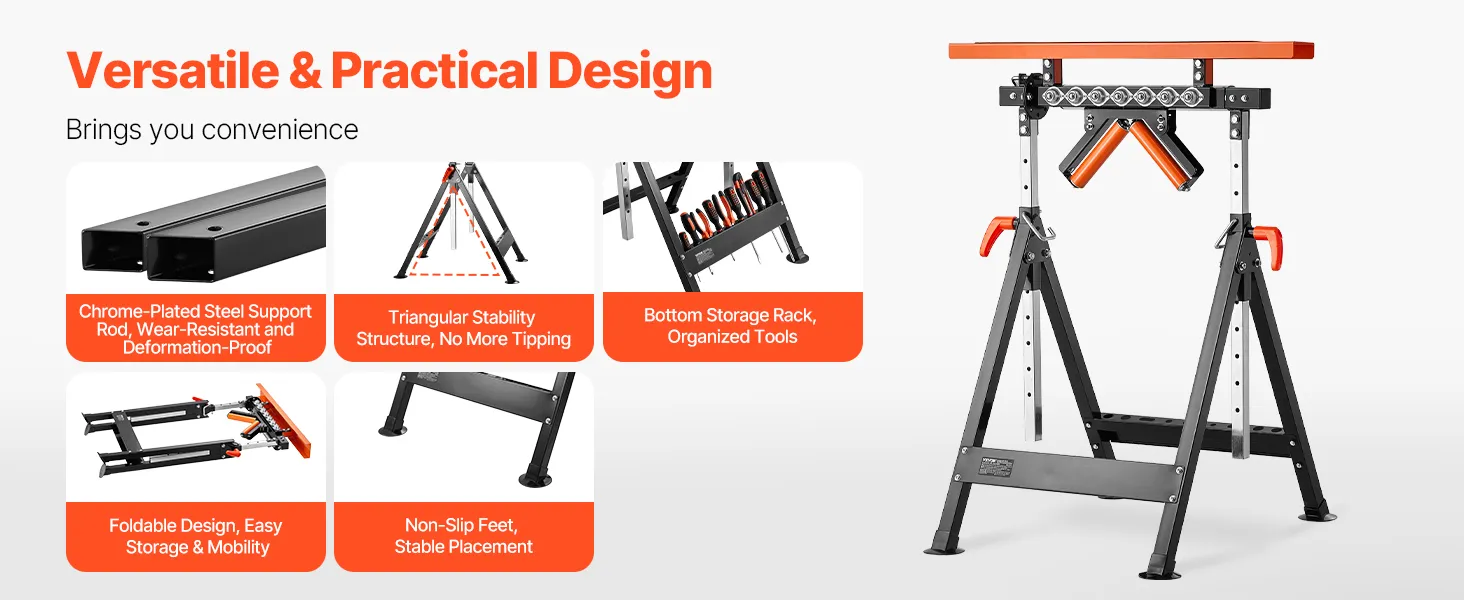 Dankzij de driehoekige constructie biedt het rolstatief een stevige grip, heeft een maximaal draagvermogen van 200 kg en is de hoogte verstelbaar van 84 tot 127 cm. Het biedt ruimte voor flexibele verplaatsing, vaste rollen, een zaagverlenging en gereedschapsopslag.