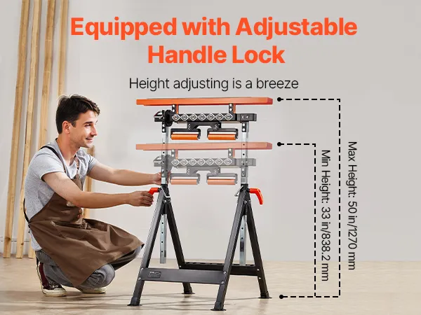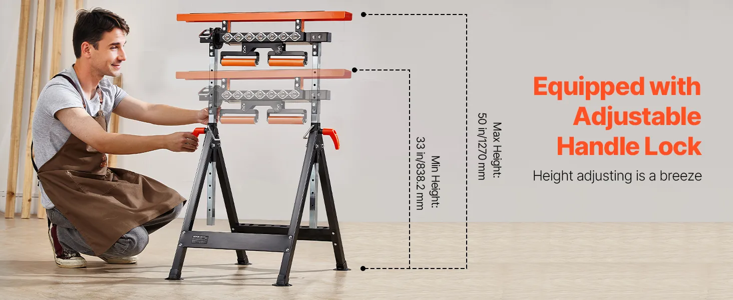 Het roltafelzaagonderstel is uitgerust met een ABS-verstelhendelvergrendeling, waarmee u de hoogte van het onderstel eenvoudig kunt verstellen van 33 tot 50 inch door de hendel te draaien, afhankelijk van uw behoeften. Dit zorgt voor flexibiliteit tijdens het gebruik.