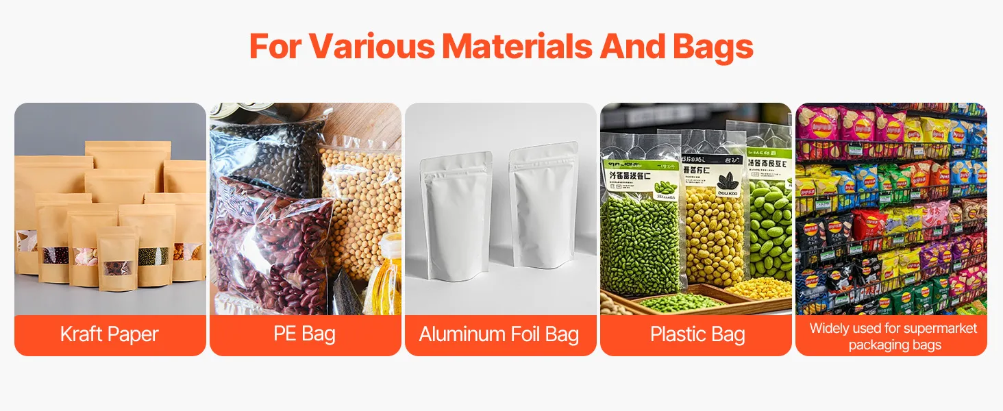 The band sealer handles various materials and bag types effortlessly—from kraft paper, PE bags to aluminum foil bags and plastic bags. Whatever type of item you need to seal, it delivers safe, secure seals for durable preservation.