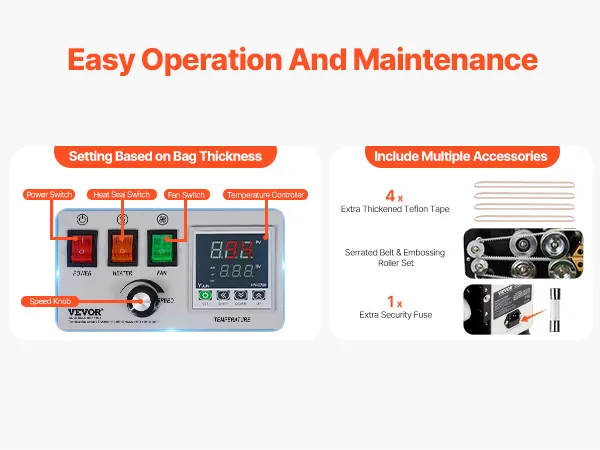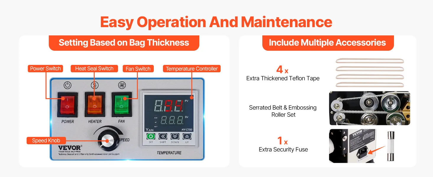 With an intuitive control panel and included accessories, our continuous bag sealer simplifies operation and maintenance. Easily adjust settings for different bag thicknesses, ensuring consistent sealing performance.