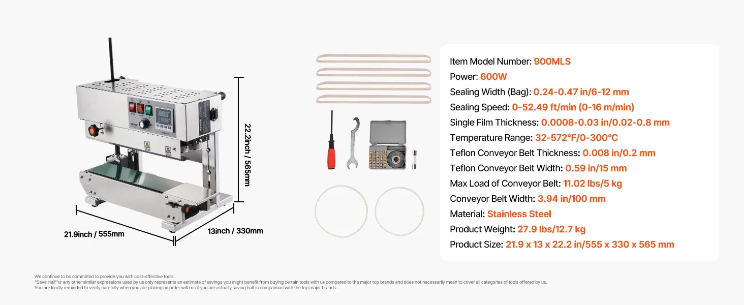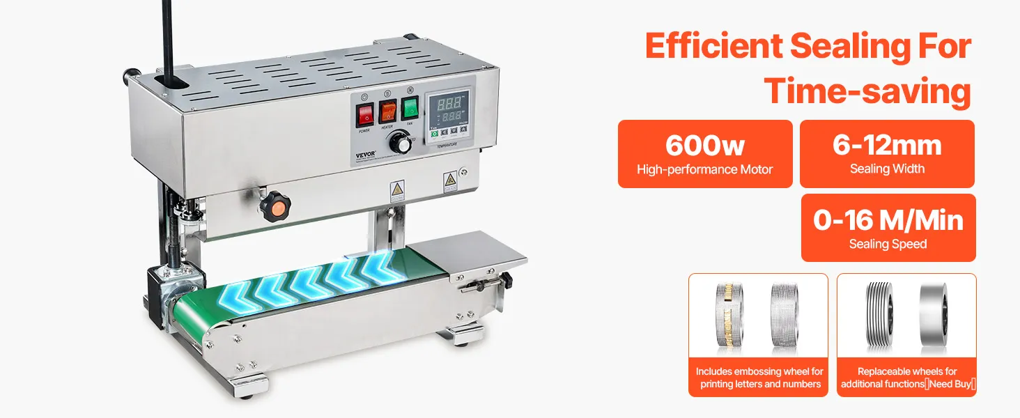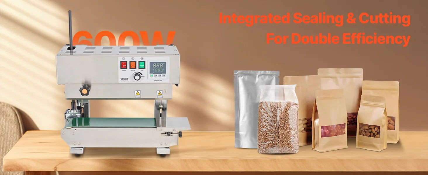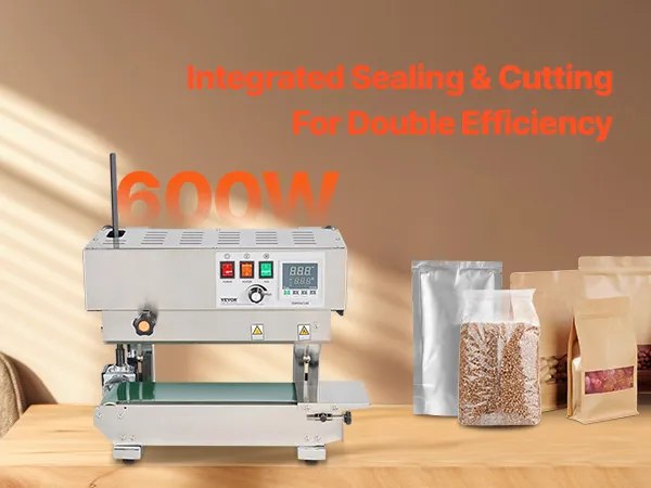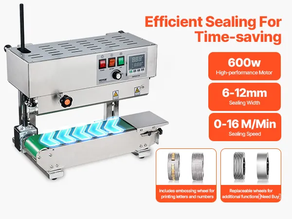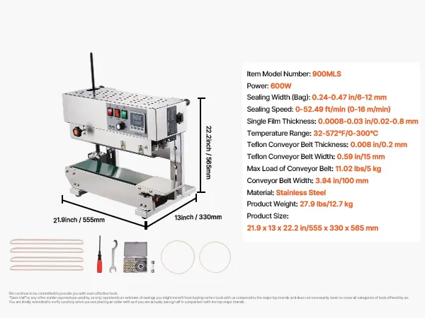 Snelle afdichting: onze eindeloze bandafdichter heeft een krachtig ontwerp en hoogwaardige materialen voor een stabiele, efficiënte afdichting. Met een vermogen van 600 W en een duurzame roestvrijstalen constructie zorgt hij voor consistente prestaties zonder corrosie of roest, wat de betrouwbaarheid op lange termijn ondersteunt.