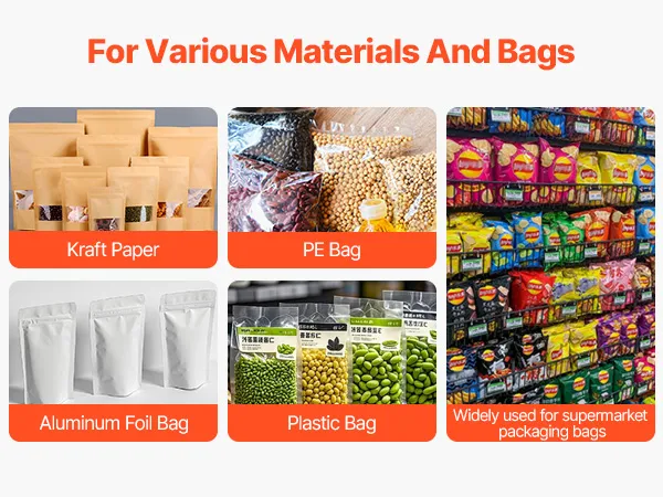 De bandlasser verwerkt moeiteloos verschillende materialen en soorten zakken: van kraftpapier, PE-zakken tot aluminiumfoliezakken en plastic zakken. Ongeacht het type item dat u wilt verzegelen, het levert veilige afdichtingen voor langdurige bewaring.