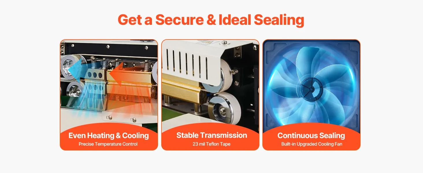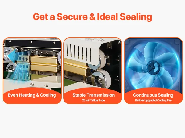 Dankzij het geavanceerde verwarmingsblok voor snelle verwarming en koeling draait onze continue sealmachine soepel zonder oververhitting. Het bevat een 23-draads Teflon-tape voor een perfecte afdichting en een verbeterde ventilator.