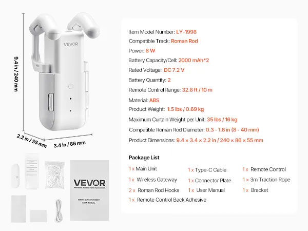 VEVOR Automatische Gordijnopener (Bediening via App & Afstandsbediening) Elektrische Gordijnopener, Compatibel met Alexa & Google Home, met Stille Modus & Timer, voor Romeinse Gordijnroedes