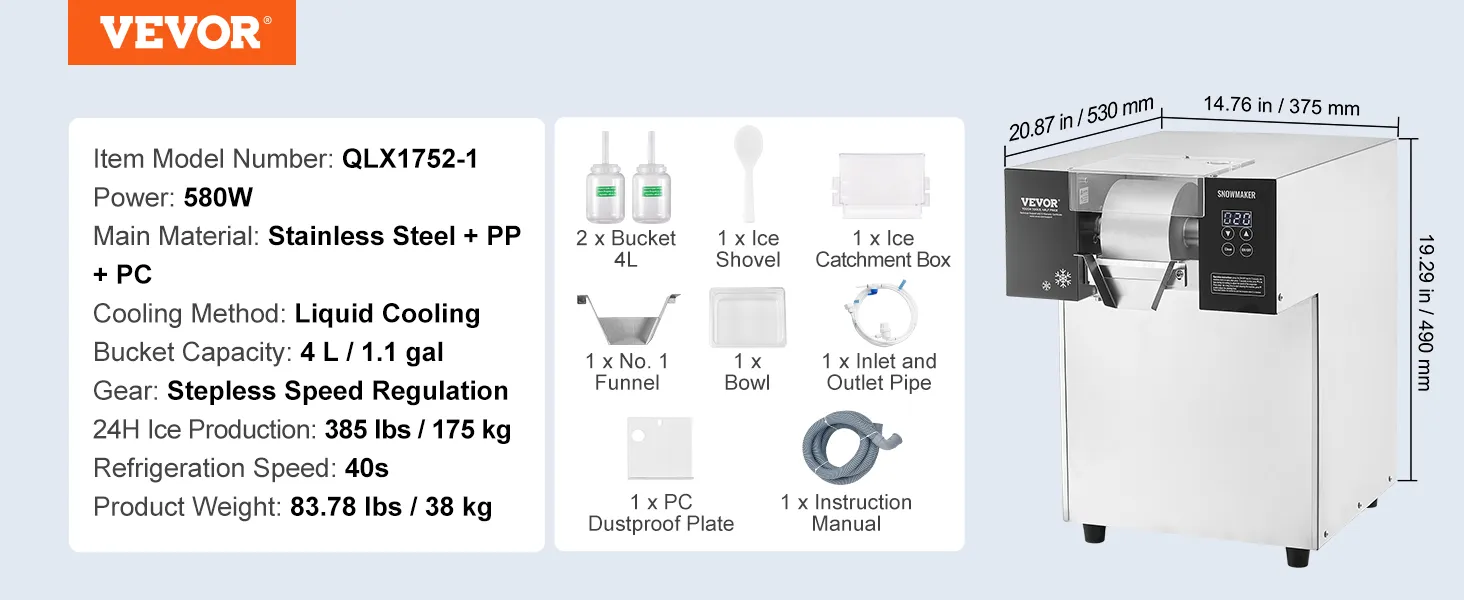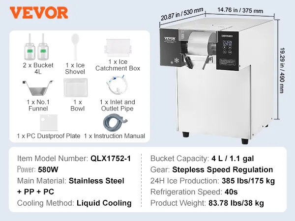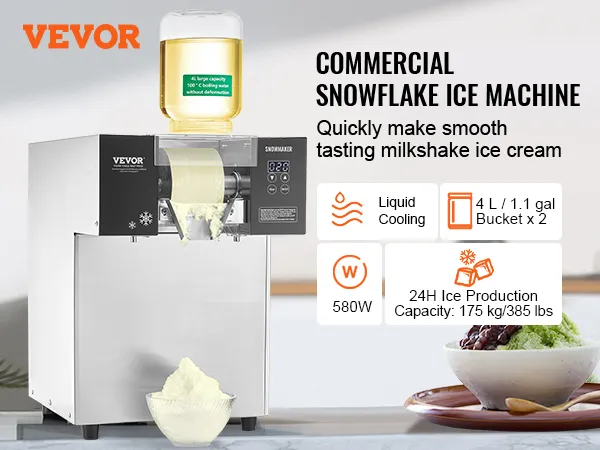 Efficiënte en continue ijsproductie: de sneeuwvlokijsmachine beschikt over een krachtig, stabiel vloeistofkoelsysteem dat een snelle koeling in 40 seconden bereikt en ijs produceert in slechts 3 seconden na het voorkoelen. Hij kan ongeveer 175 kg ijs per dag produceren en is ideaal voor de productie van diverse dranken, zoals suikerhoudende dranken, alcoholische dranken met een alcoholgehalte van minder dan 10°, vruchtensapdranken en melk.