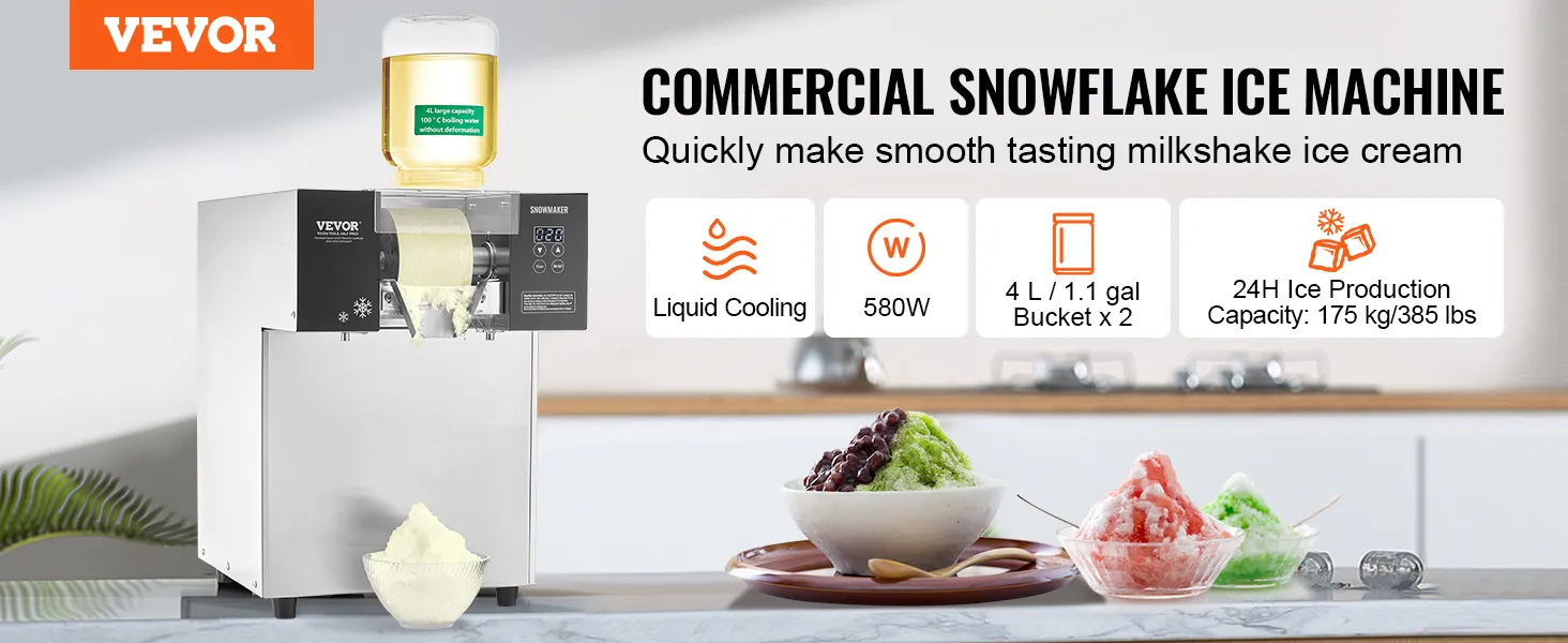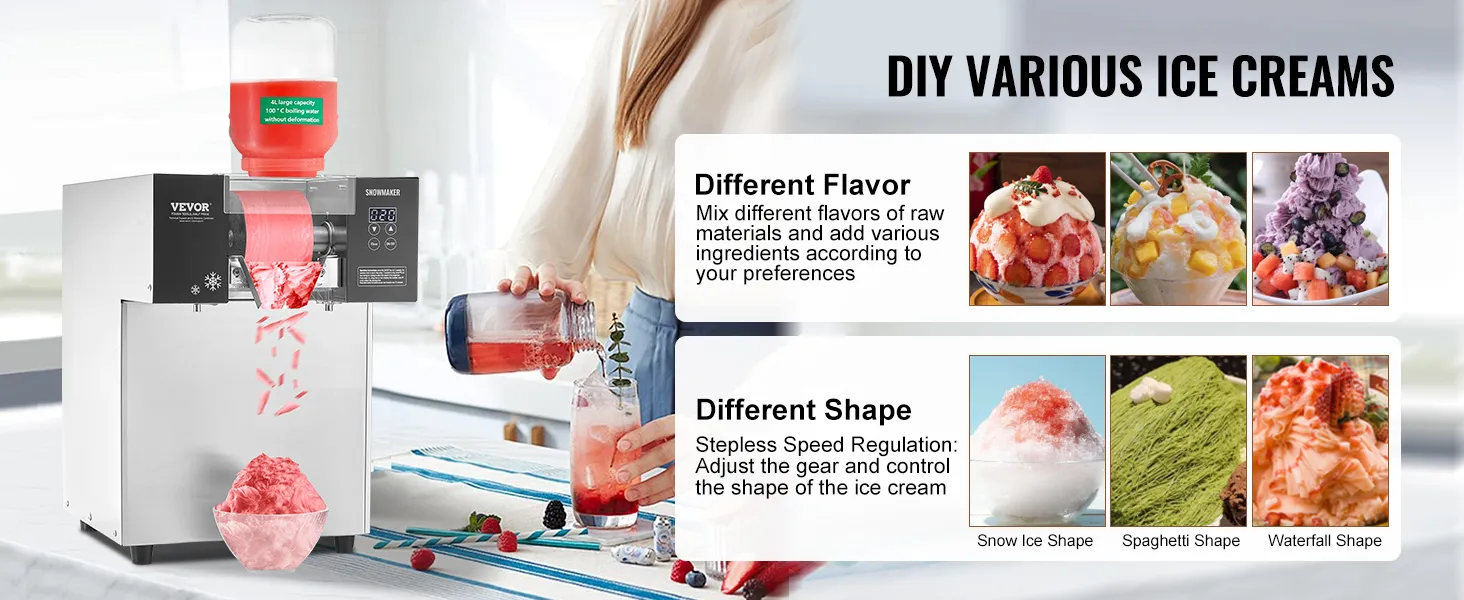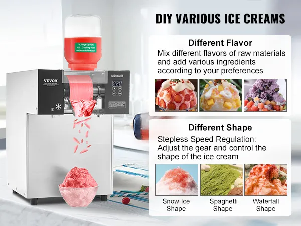 Verschillende ijsvormen: door de rolsnelheid aan te passen, produceert deze sneeuwvlokkenijsmachine ijs in verschillende texturen, zoals sneeuwijsvorm, spaghettivorm en watervalvorm, die elk een fluweelzachte textuur bieden.