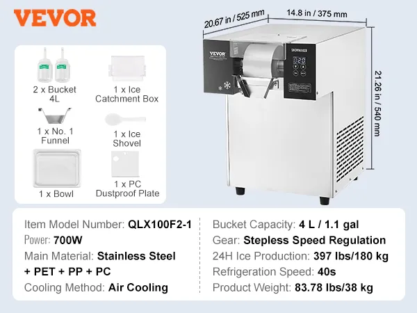 Deze ijsmachine is uitgerust met een krachtige compressor van 700 watt die zorgt voor een snelle afkoeling binnen 40 seconden. Hij beschikt over twee manden met elk een inhoud van 4 liter en kan in 24 uur tot 180 kg ijs produceren.