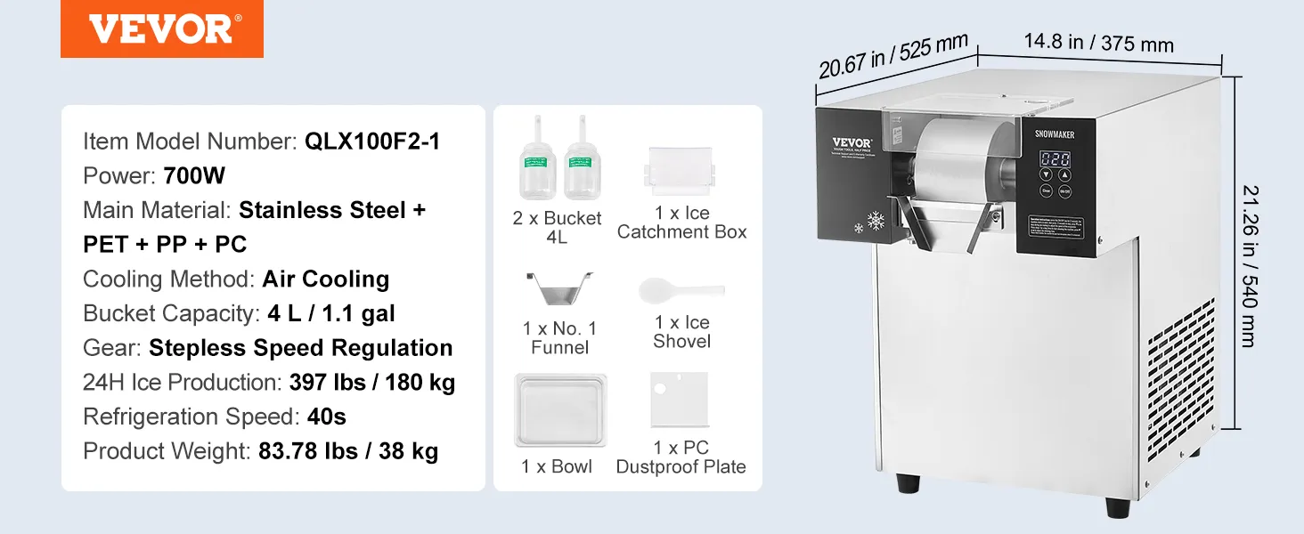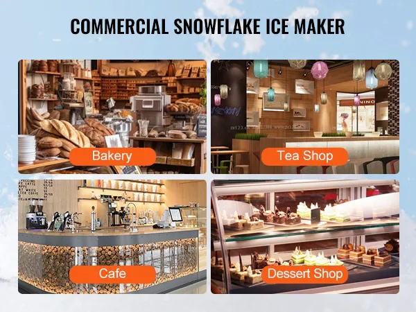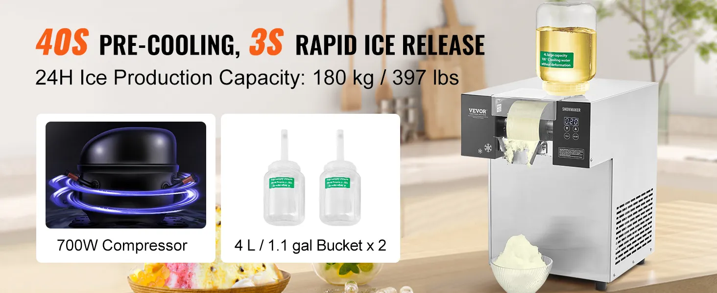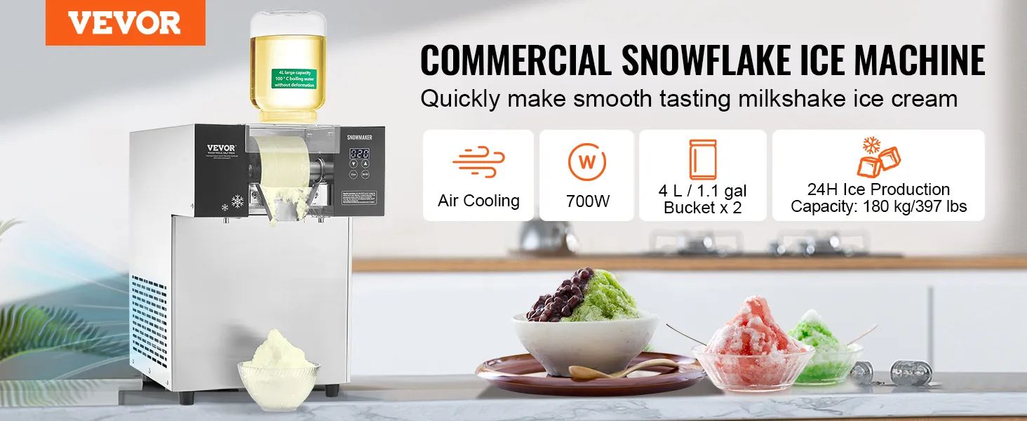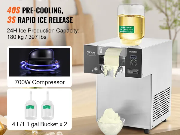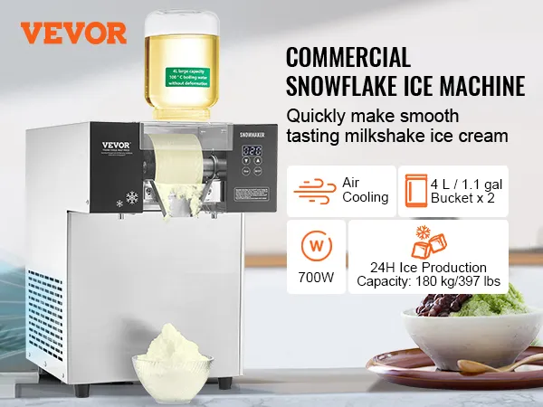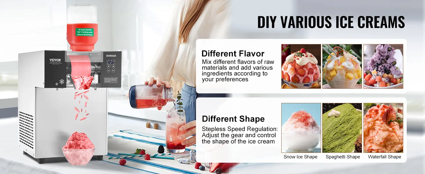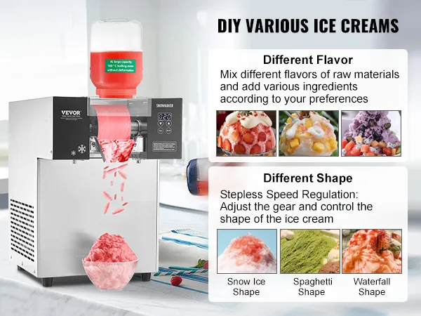 Verschillende ijsvormen: door de rolsnelheid aan te passen, produceert deze sneeuwvlokkenijsmachine ijs in verschillende texturen, zoals sneeuwijsvorm, spaghettivorm en watervalvorm, die elk een fluweelzachte textuur bieden.