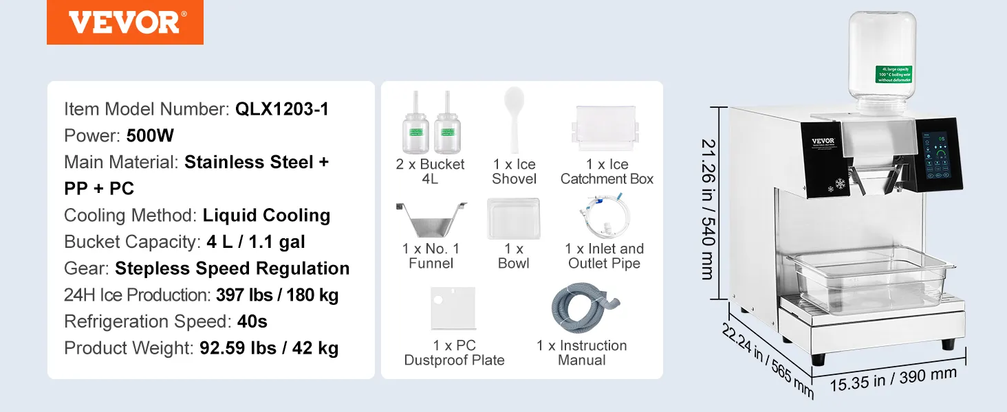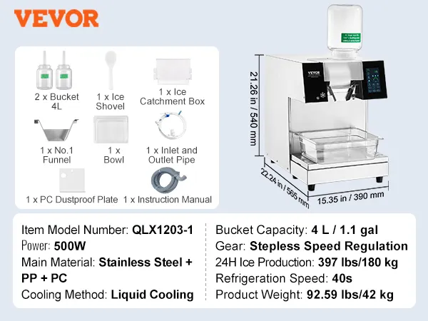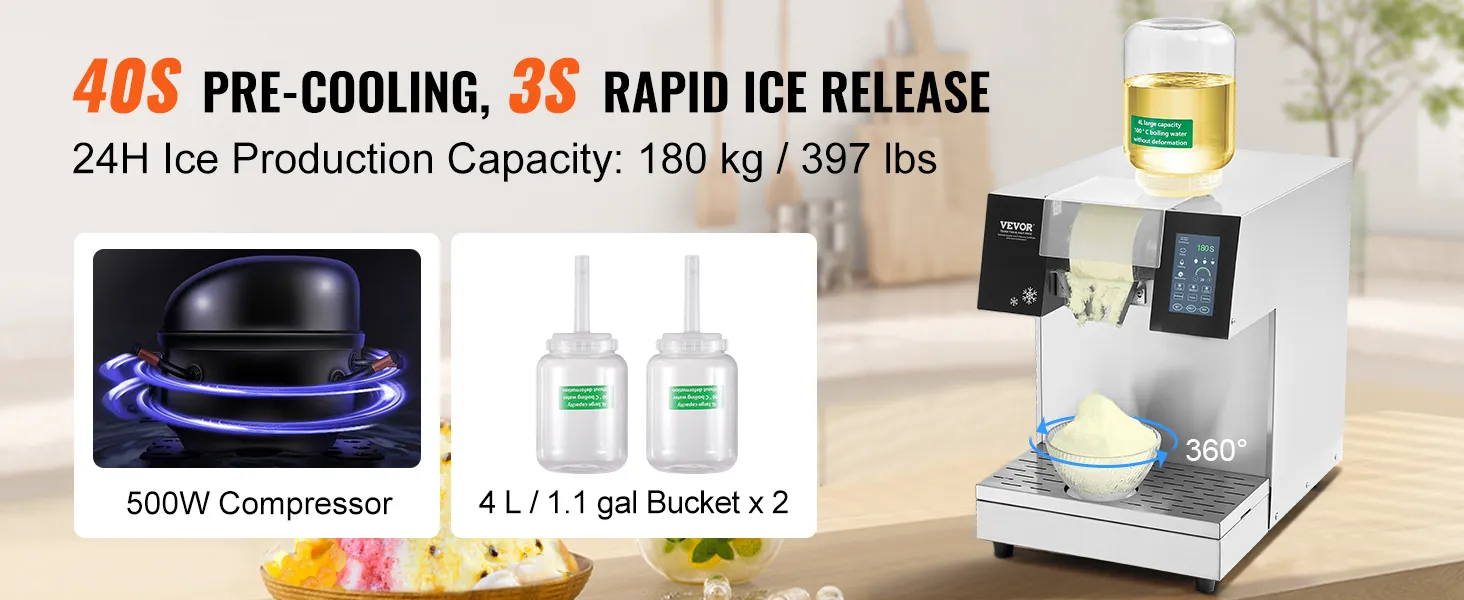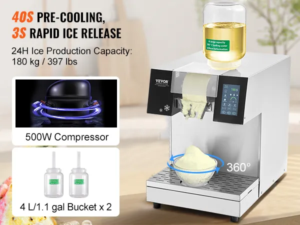 This liquid-cooled snowflake ice machine features a powerful 500W compressor that achieves rapid cooling within 40 seconds. It boasts two 4 L capacity baskets, capable of producing up to 397 lbs / 180 kg of ice in 24 hours, perfect for creating a variety of milkshake ice creams with different textures.