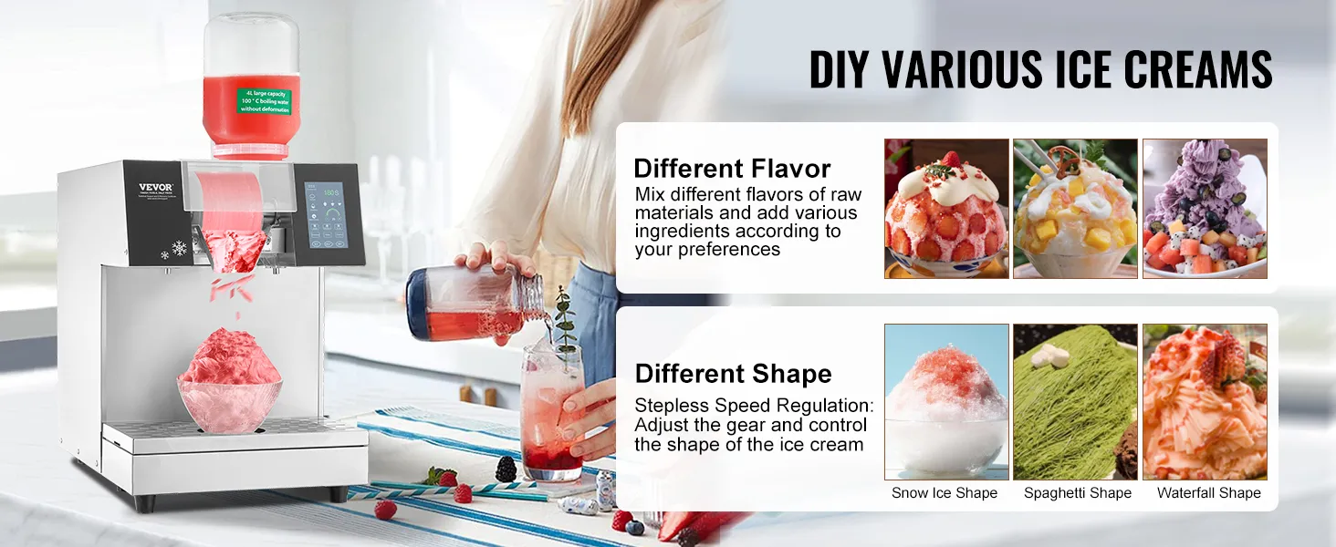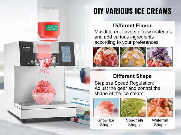 Adjust the settings to create snowflake ice, noodle ice, and other shapes and flavors of ice cream.
