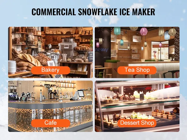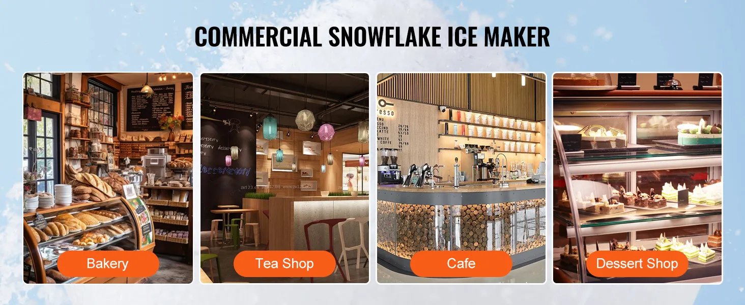 Efficient, Continuous Ice Production: The commercial snowflake ice machine features a high-performance stable liquid-cooling system, achieving quick cooling in 40 seconds and producing ice in just 3 seconds after pre-cooling, capable of producing approximately 397 lbs / 180 kg of ice per day, ideal for making various beverages such as sugar drinks, alcoholic drinks with an alcohol content of less than 10°, fruit juice drinks, and milk.