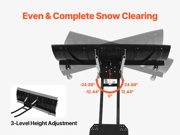 Volledig verstelbaar ontwerp: onze ATV-sneeuwschuiver biedt 5-traps hoekverstelling (max. ±24,88°) en 4-traps verticale hoogteverstelling. De sneeuwschuiver past zich gemakkelijk aan steile hellingen, diepe sneeuw of oneffen terrein aan – perfect voor zware werkomstandigheden.