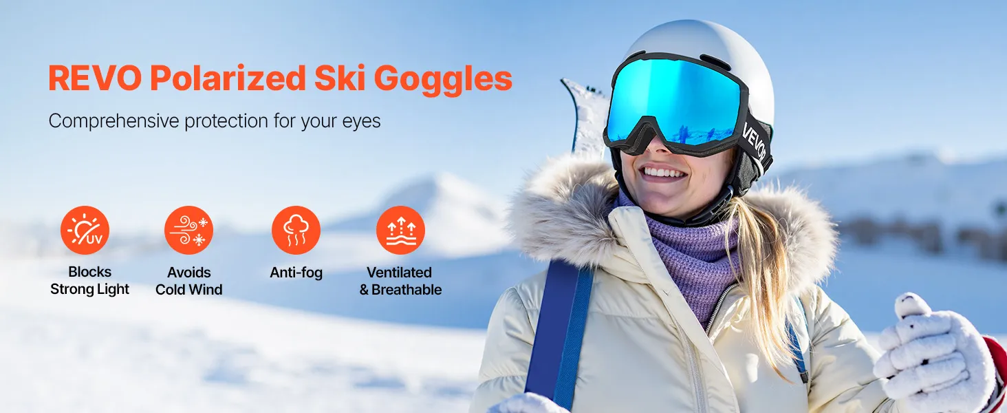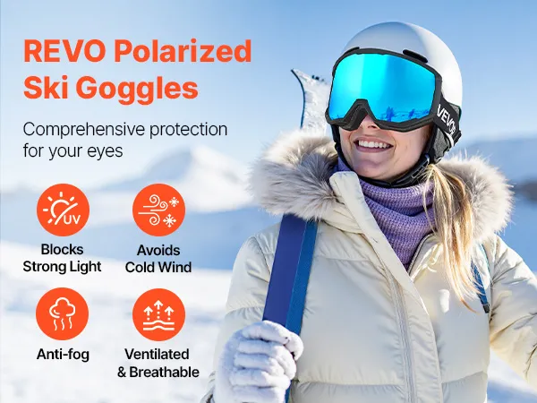 Deze Revo skibril blokkeert fel zonlicht en vermindert schittering in de sneeuw om sneeuwblindheid te voorkomen. Hij beschermt je tegen koude wind, zorgt voor een condensvrij zicht en laat frisse lucht binnen, zodat je zorgeloos van elke afdaling kunt genieten.