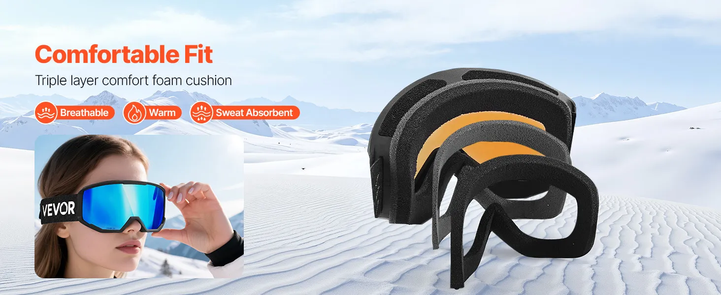 Blokkeert fel licht: Deze skibril blokkeert schittering in de sneeuw, waardoor uw ogen minder snel vermoeid raken en u helder zicht hebt. De comfortabele, condensvrije pasvorm blijft helder bij zonnig en bewolkt weer, zodat u comfortabel en veilig kunt skiën.