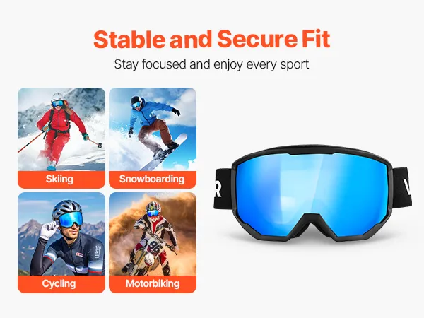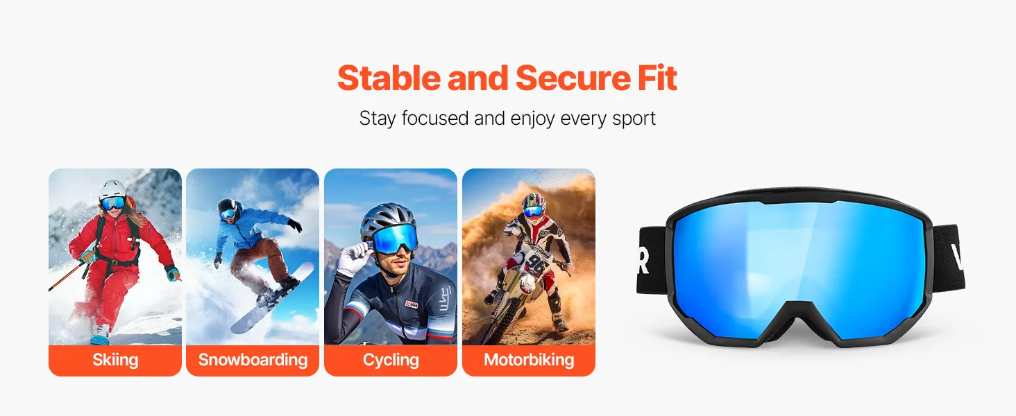 OTG-montuur: De skibril met breed montuur past zonder druk op de meeste brillen tot 11,68 x 5,84 cm (4,6 x 2,3 inch). Hij blijft goed zitten zonder te verschuiven, waardoor je de hele dag een breed en onbelemmerd zicht hebt.