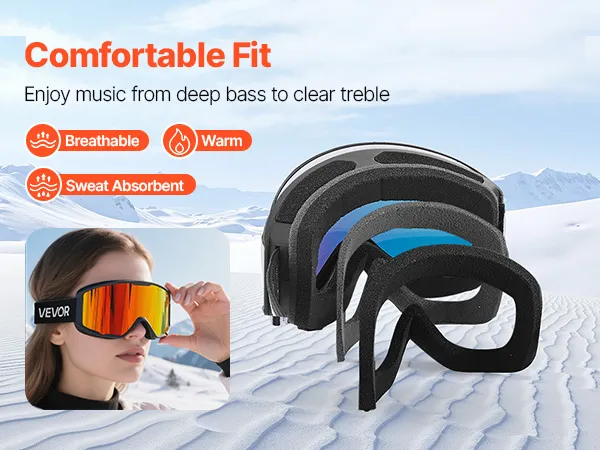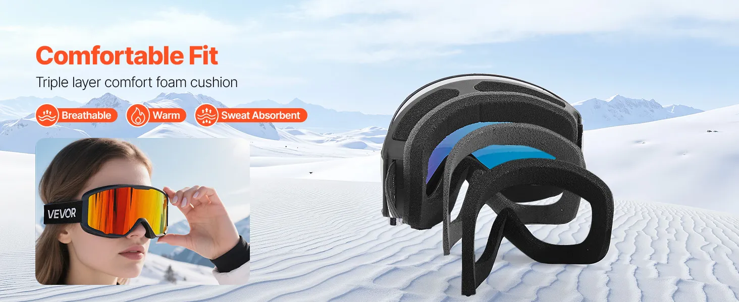 Het zachte drielaagse schuim van de snowboardbril vormt zich soepel naar je gezicht, absorbeert schokken en houdt koude lucht buiten. Het ademende, vochtafvoerende ontwerp houdt je warm, zweetvrij en comfortabel, de hele dag skiënd.