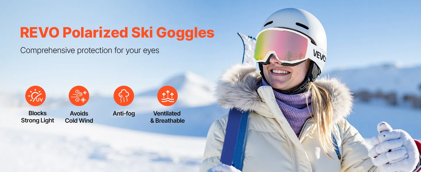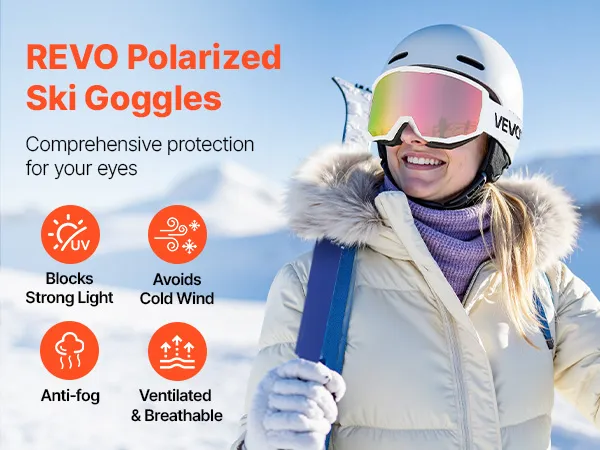 Deze Revo skibril blokkeert fel zonlicht en vermindert schittering in de sneeuw om sneeuwblindheid te voorkomen. Hij beschermt je tegen koude wind, zorgt voor een condensvrij zicht en laat frisse lucht binnen, zodat je zorgeloos van elke afdaling kunt genieten.