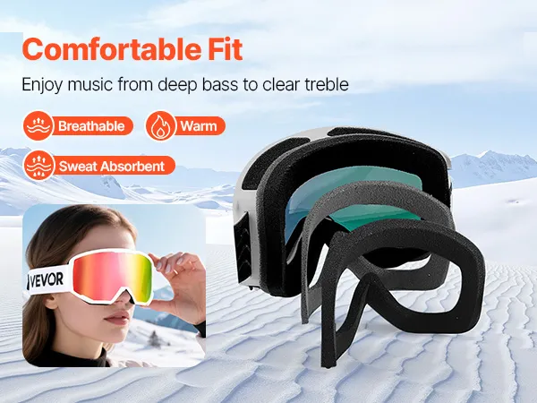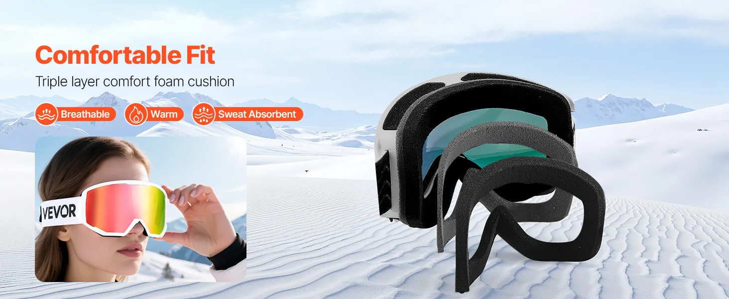 Het zachte drielaagse schuim van de snowboardbril vormt zich soepel naar je gezicht, absorbeert schokken en houdt koude lucht buiten. Het ademende, vochtafvoerende ontwerp houdt je warm, zweetvrij en comfortabel, de hele dag skiënd.